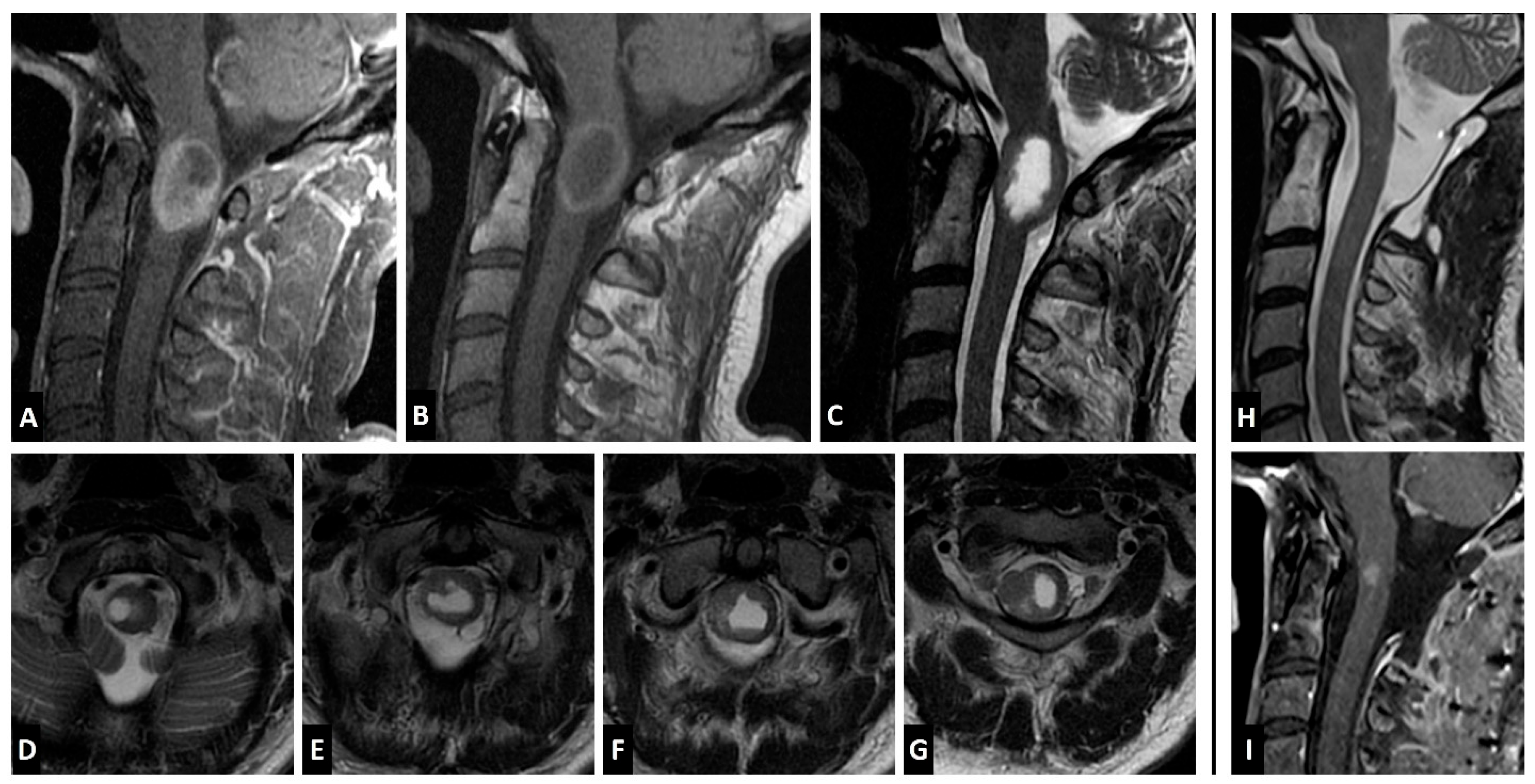 - Wagner, F.; Berezowska, S.; Wiest, R.; Gralla, J.; Beck, J.; Verma, R.K.; Huber, A. Primary Intramedullary Melanocytoma in the Cervical Spinal Cord: Case Report and Literature Review. Radiol. Case Rep. 2015, 10, 1010. [Google Scholar] [CrossRef]