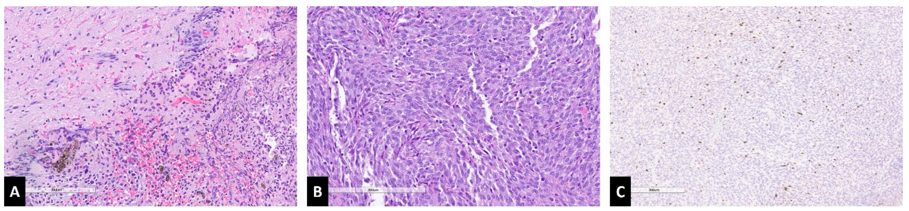 - Brat, D.J.; Giannini, C.; Scheithauer, B.W.; Burger, P.C. Primary Melanocytic Neoplasms of the Central Nervous Systems. Am. J. Surg. Pathol. 1999, 23, 745–754. [Google Scholar] [CrossRef]