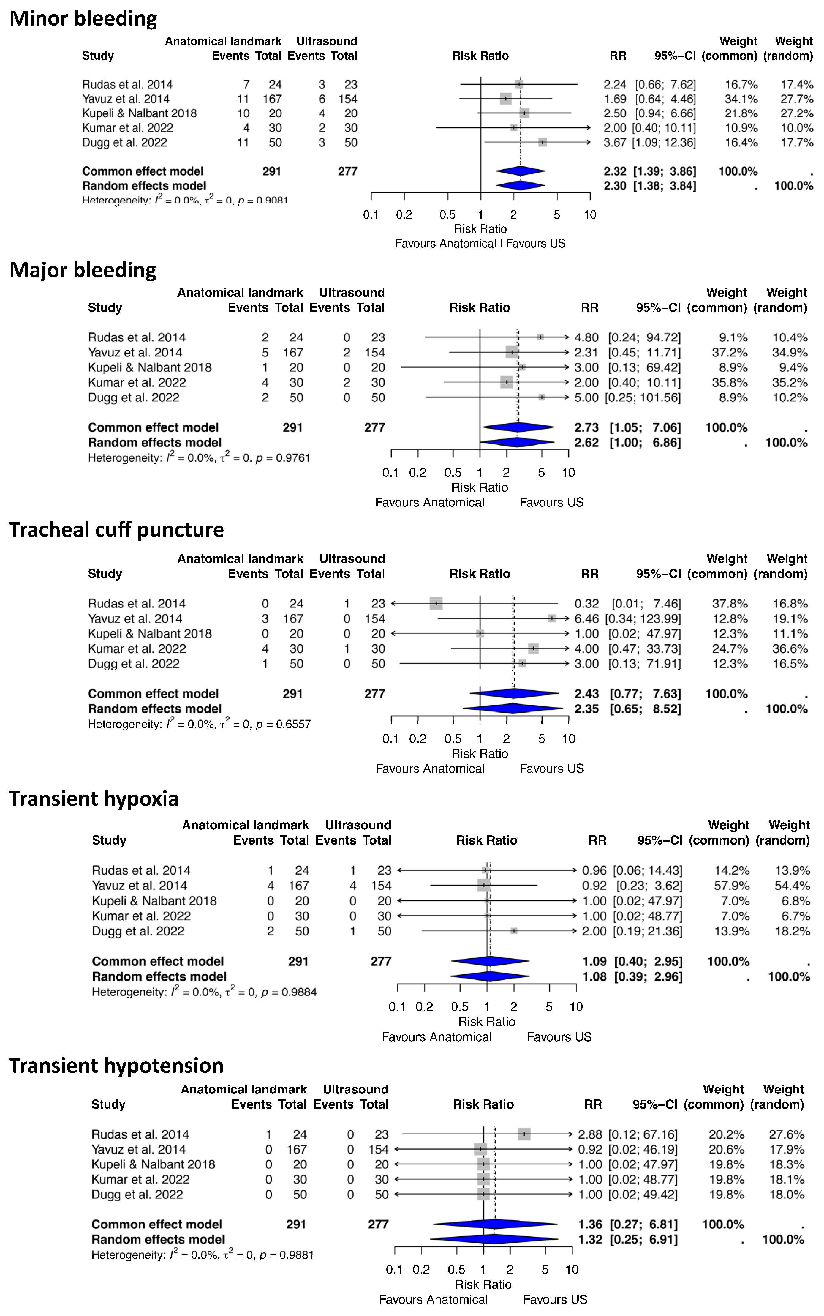 | 2 | Sarıtas (2019) [9] | RCT | Critically ill adults, mean APACHE II 17.9 | USG | BG | Hemorrhage, procedure duration | February–March 2017, Turkey | 80 (40 US, 40 B) | Lower hemorrhage in US-PDT (p < 0.05), shorter duration in US-PDT (p < 0.05) | Low RoB RCT with randomization and complete data; lack of blinding of participants is a minor issue. |