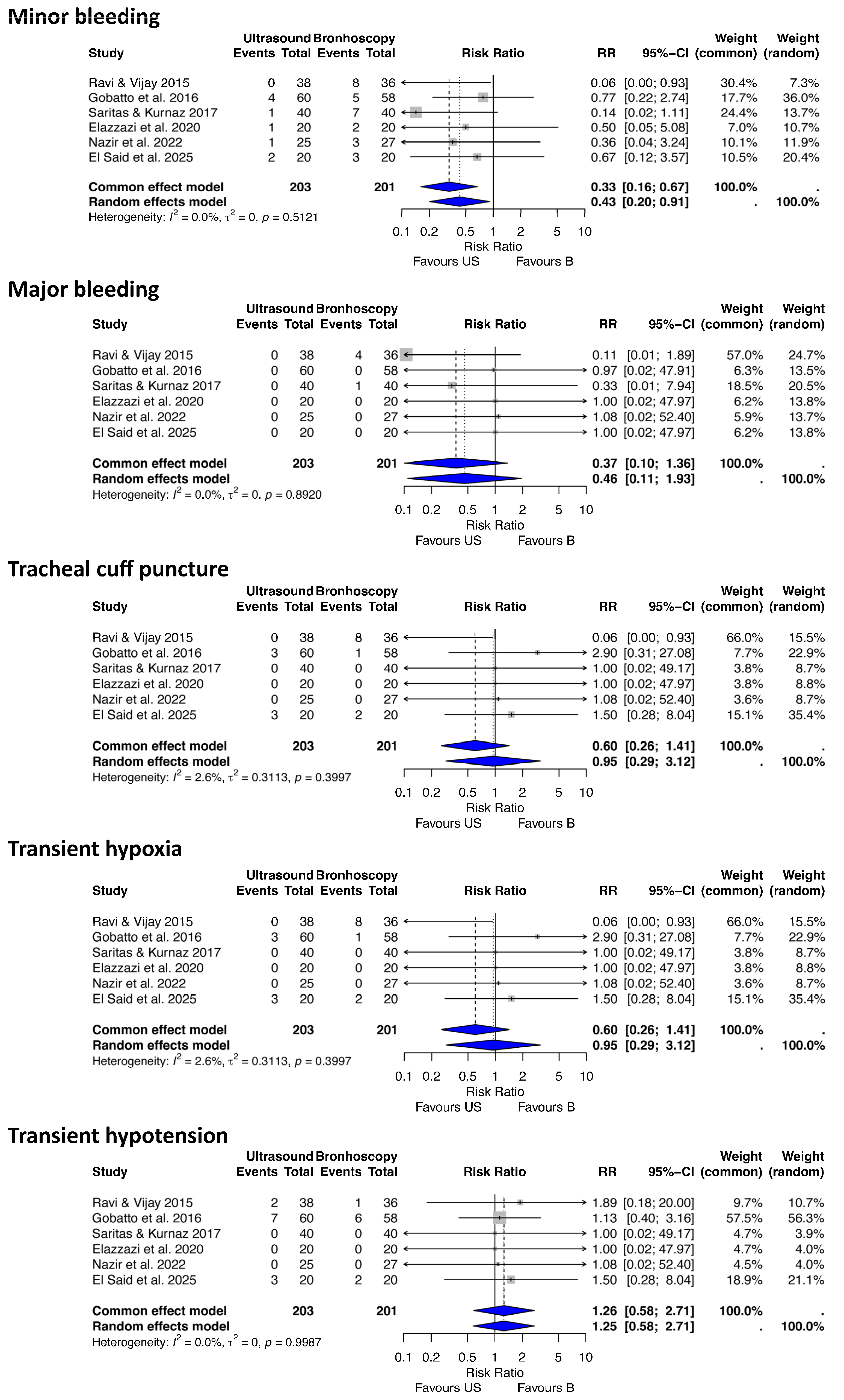 | 6 | El Said (2025) [44] | RCT | Mechanically ventilated critically ill patients in ICU requiring prolonged ventilation | USG | BG | Safety and effectiveness (e.g., procedural duration, complications, outcomes like P/F ratio, ICU/hospital stay, mortality; no significant differences except shorter duration in ultrasound) | Not specified, Egypt (Menoufia University Hospital) | 40 (20 US, 20 B) | Ultrasound- or bronchoscopy-guided PDT showed comparable results in terms of complications and outcomes in critically ill patients; however, a significant difference was noted in procedural duration (shorter with ultrasound). | Low RoB (RCT with randomization, ethical approval, and CONSORT compliance) |