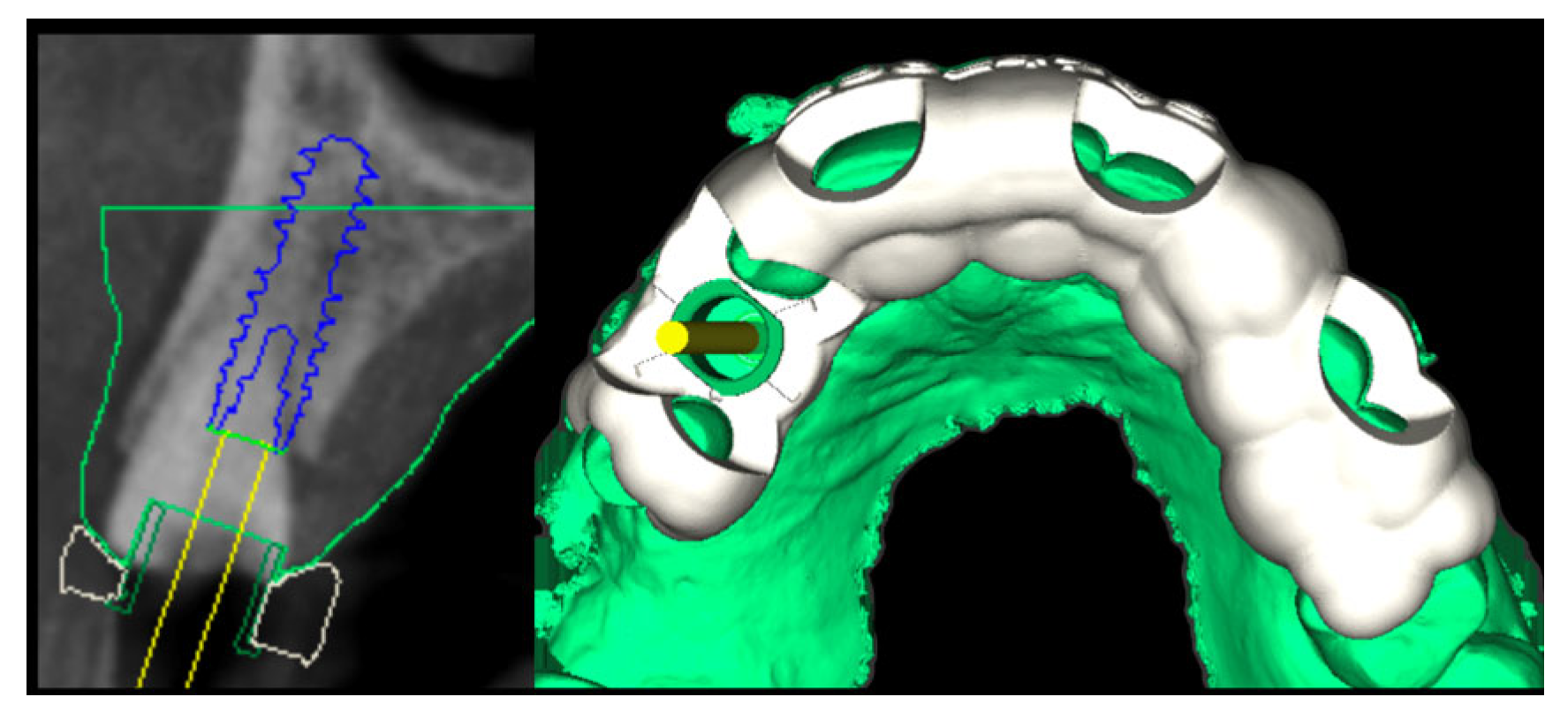 - Marchack, C.B. CAD/CAM-guided implant surgery and fabrication of an immediately loaded prosthesis for a partially edentulous patient. J. Prosthet. Dent. 2007, 97, 389–394. [Google Scholar] [CrossRef] [PubMed]
