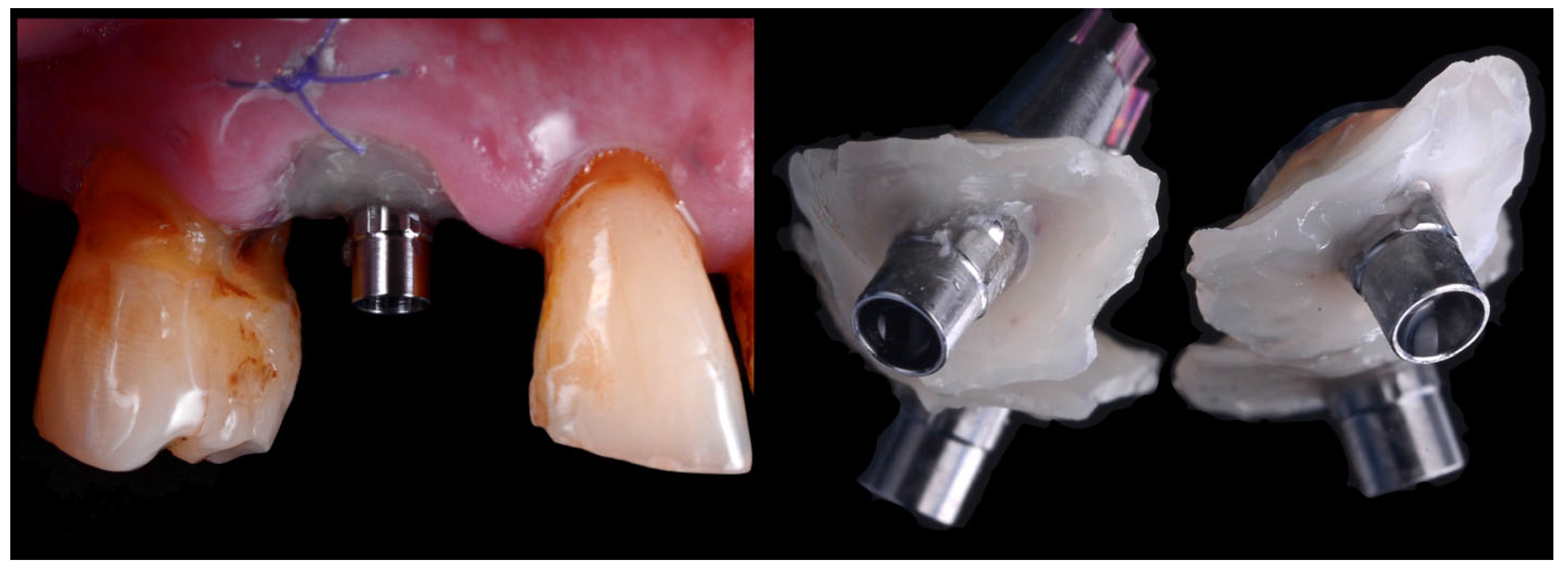 - Ruhstorfer, M.; Güth, J.-F.; Stimmelmayr, M.; Waltenberger, L.; Schubert, O.; Graf, T. Systematic review of peri-implant conditions and aesthetic outcomes of customized versus conventional healing abutments. Int. J. Implant Dent. 2024, 10, 61. [Google Scholar] [CrossRef]