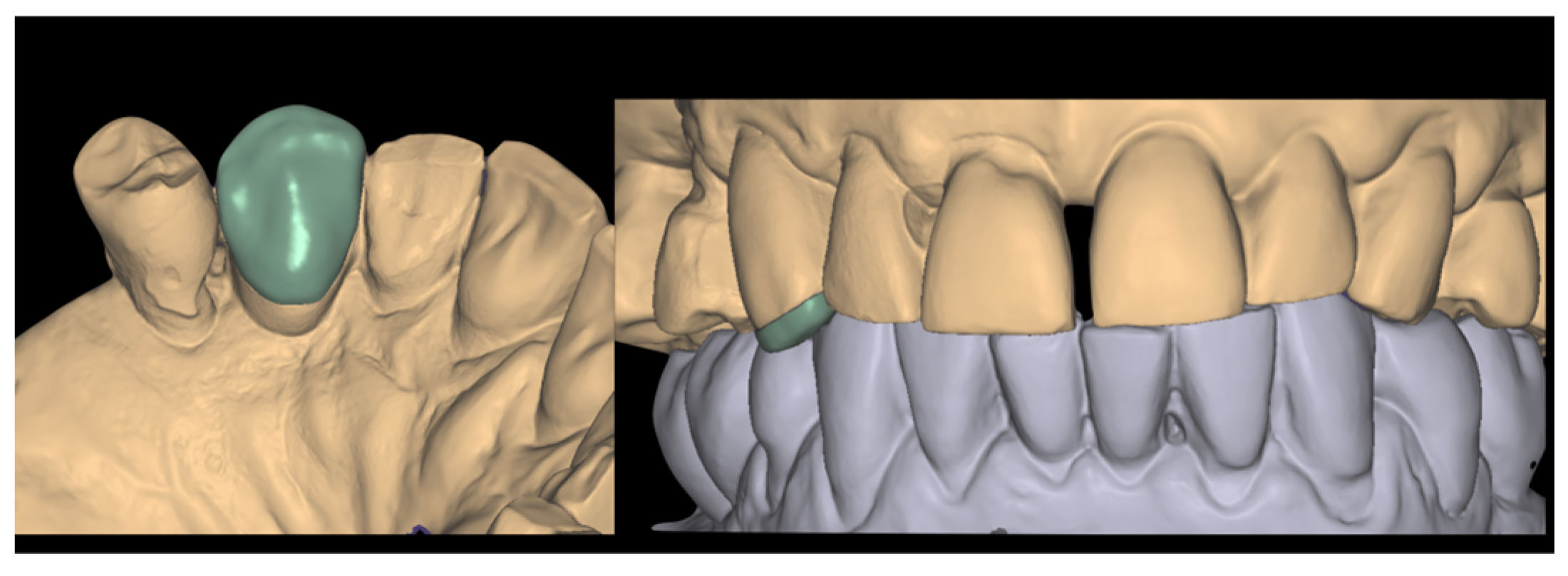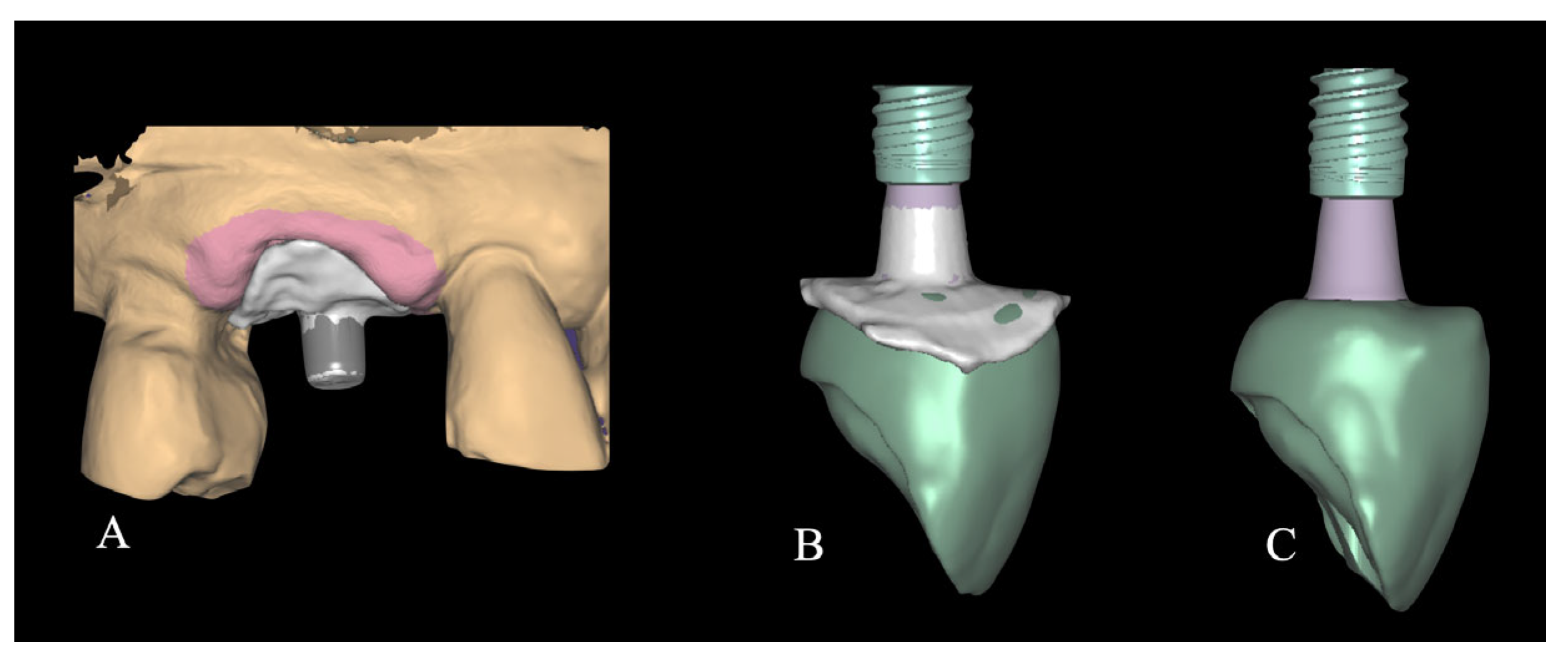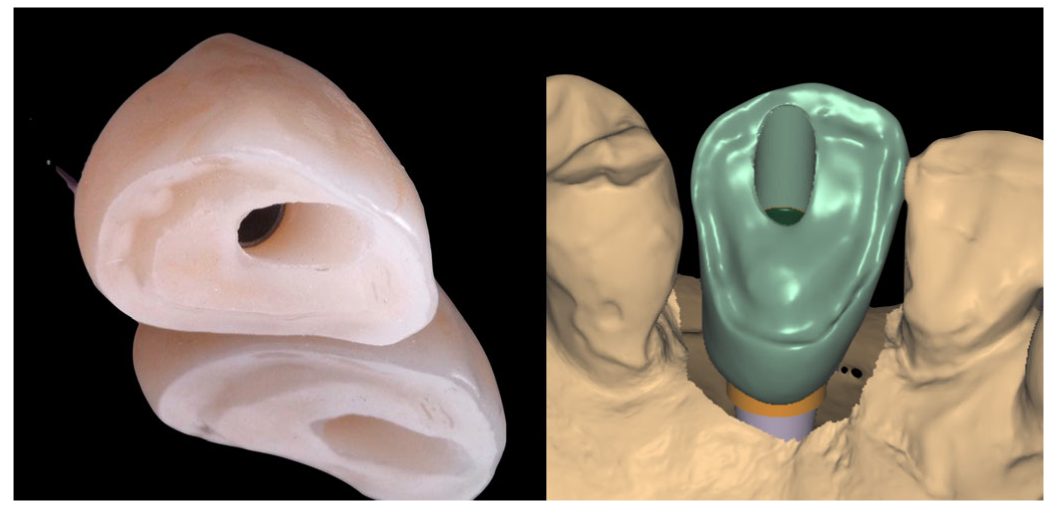- Parpaiola, A.; Norton, M.R.; Cecchinato, D.; Bressan, E.; Toia, M. Virtual Abutment Design: A Concept for Delivery of CAD/CAM Customized Abutments-Report of a Retrospective Cohort. Int. J. Periodontics Restor. Dent. 2013, 33, 51–58. [Google Scholar] [CrossRef]