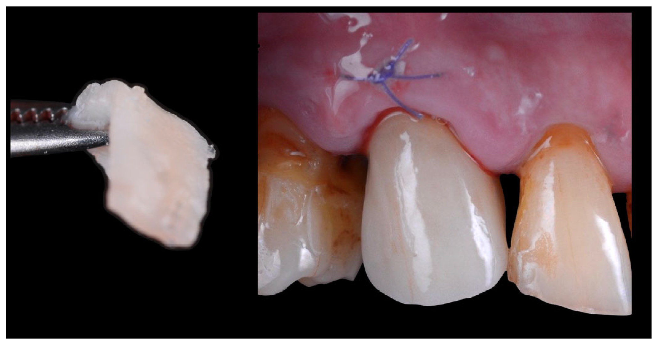 - Thoma, D.S.; Gasser, T.J.; Hämmerle, C.H.; Strauss, F.J.; Jung, R.E. Soft tissue augmentation with a volume-stable collagen matrix or an autogenous connective tissue graft at implant sites: Five-year results of a randomized controlled trial post implant loading. J. Periodontol. 2023, 94, 230–243. [Google Scholar] [CrossRef]