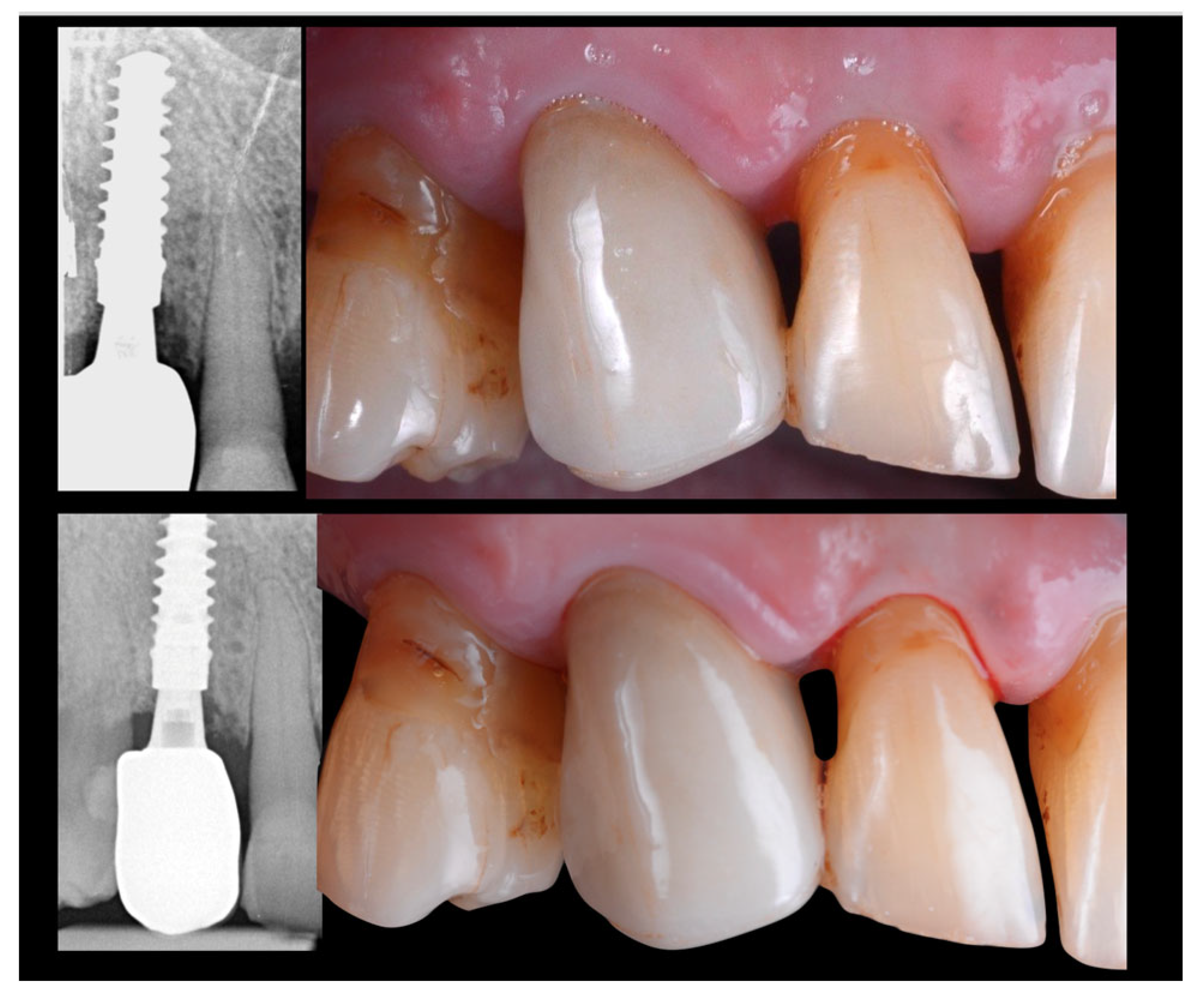 - Chen, S.T.; Buser, D. Esthetic outcomes following immediate and early implant placement in the anterior maxilla—A systematic review. Int. J. Oral Maxillofac. Implant. 2014, 29, 186–215. [Google Scholar] [CrossRef]