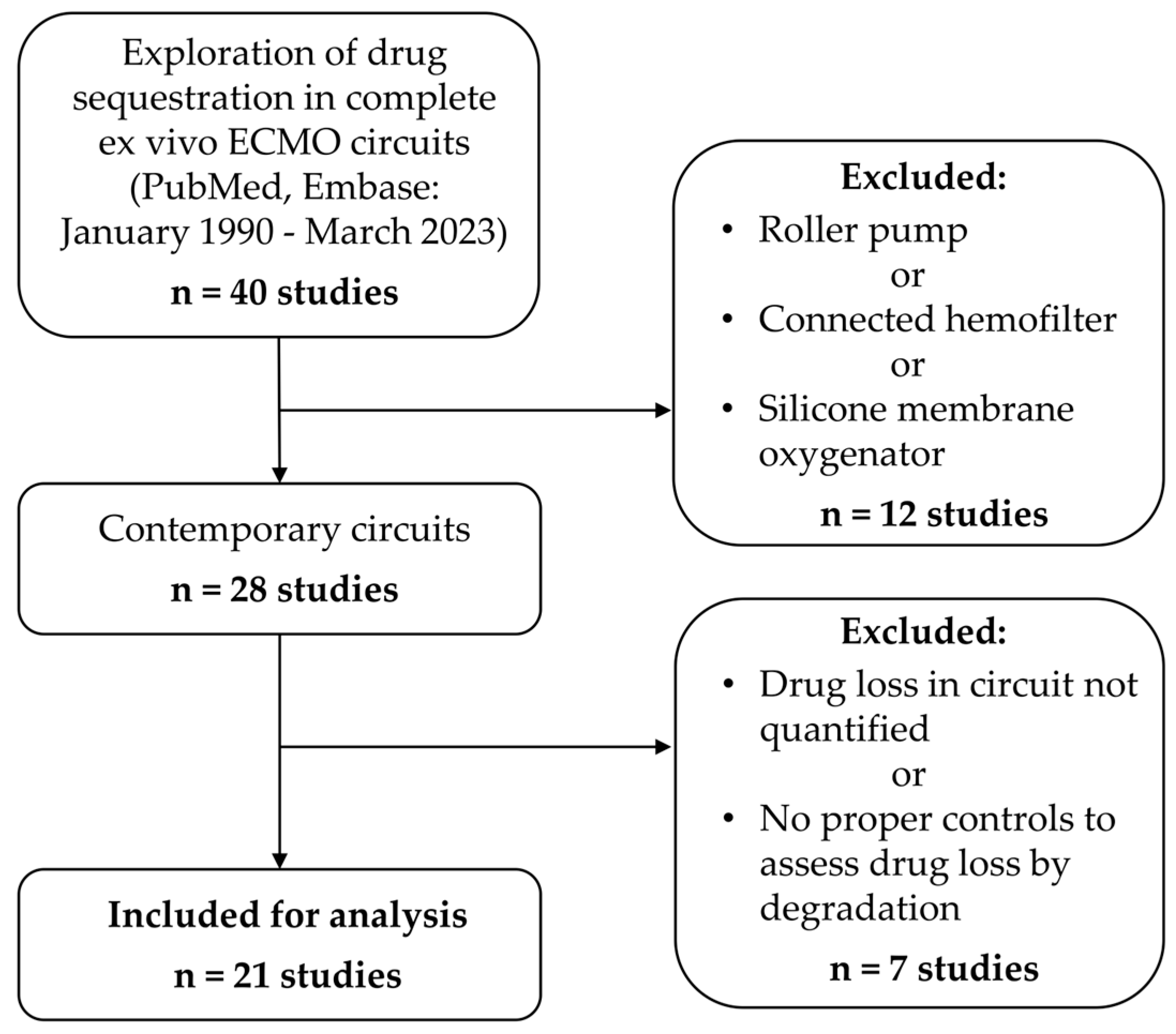 APA StyleBertin, S., Haefliger, D., Schneider, A. G., Giraud, R., Perez, M.-H., Bechtold, X., Di Paolo, E. R., Rothuizen, L. E., Buclin, T., & Livio, F. (2025). Effects of Extracorporeal Membrane Oxygenation Circuits on Drug Sequestration: A Review of Ex Vivo Experiments. Journal of Clinical Medicine, 14(22), 8060. https://doi.org/10.3390/jcm14228060