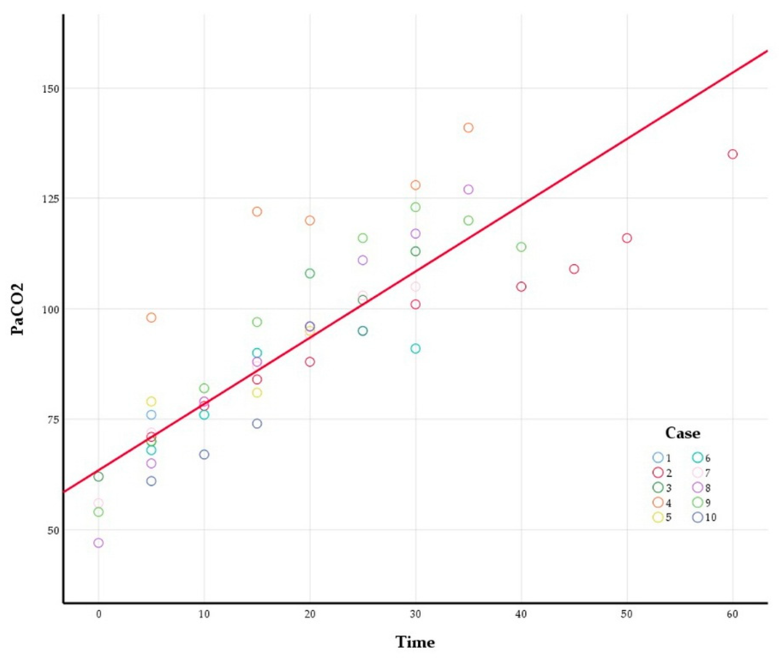 2 was estimated to increase by 1.50 mmHg per min (95% confidence interval, 1.25–1.76 mmHg). Furthermore, a significant positive correlation was observed among repeated PaCO