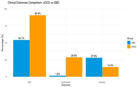 The inclusion of terminal donor creatinine in our analysis (1.9 ± 0.1 mg/dL for uDCD versus 1.2 ± 1.3 mg/dL for DBD, p = 0.042) highlights another selection factor. The higher terminal creatinine in uDCD donors likely reflects the physiological stress of cardiac arrest and resuscitation attempts, yet these organs achieved acceptable function, suggesting that mild elevation in terminal creatinine should not preclude uDCD organ utilization [24].