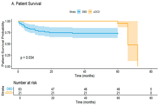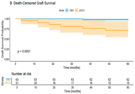 Kaplan–Meier analysis revealed significant differences in the graft survival rate between groups. The death-censored 5 year graft survival rate was 71.4% for uDCD versus 98.4% for DBD recipients (log-rank p < 0.001) (Figure 2B). Patient survival showed a non-significant trend favoring uDCD recipients, with a 5 year survival rate of 85.7% versus 72.1% (log-rank p = 0.209) (Figure 2A).