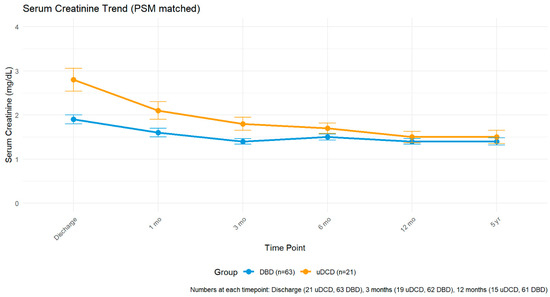 The follow-up duration was calculated from the transplant date to the last clinical visit, death, or 31 December 2024. All patients had a minimum of a 5 year follow-up, with serum creatinine measurements available at all protocol time points.