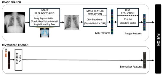To further understand this area, this study presents a pipeline that combines chest radiography and blood biomarkers. It first extracts high-level feature maps from CXR using a pretrained convolutional neural network-based backbone and then reduces them via partial least Squares discriminant analysis (PLS-DA). Three fusion strategies were compared: early fusion, which concatenates PLS-DA output with normalized biomarker vectors before classification; late fusion, which trains separate classifiers on each modality and averages their probabilities; and hybrid fusion, which combines early fusion scores with late fusion probabilities. Each strategy used shallow machine learning classifiers (support vector machine (SVM), random forest (RF), and category boosting (CatBoost), tuned through nested, group-aware cross-validation to ensure no patient overlap between folds. In a cohort of matched imaging and laboratory records, these multimodal models successfully integrated complementary structural and biochemical information to outperform unimodal baselines.