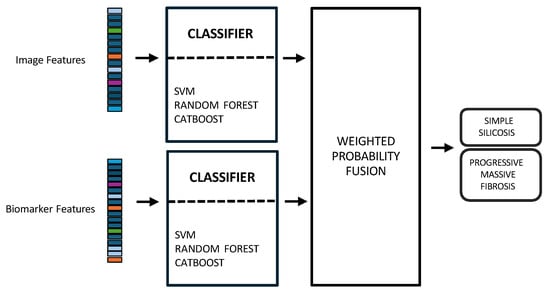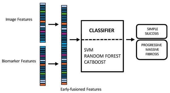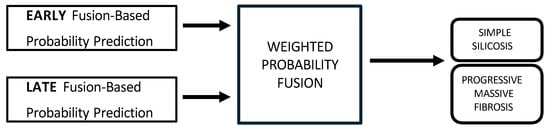 Modality-level fusion techniques, including the early, intermediate, and late fusion, have demonstrated significant potential to improve predictive precision in various healthcare domains, particularly in the diagnosis and prognosis of diseases [,]. In this study, a multimodal framework for staging of silicosis is proposed, as illustrated in Figure 1.