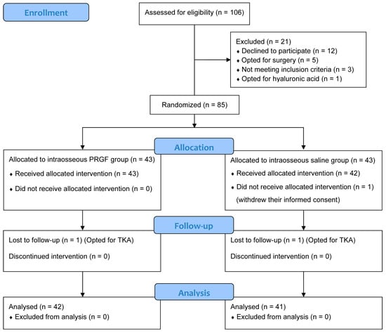 Between October 2017 and March 2022, 106 patients were assessed for study eligibility. Of these, 21 were excluded and 86 patients were finally randomized and allocated to the intraosseous PRGF group (n = 43) or intraosseous saline group (n = 43), but one patient in the saline group withdrew their informed consent and did not receive the treatment (Figure 1). Two patients dropped out of the study, one from each group, and chose to undergo total knee replacement instead. Finally, 42 patients were analyzed in the intraosseous PRGF group while 41 patients were in the intraosseous saline group. Both groups were homogeneous at baseline for all the parameters, without any statistically significant differences in terms of sex, age, body mass index, laterality, OA grade or baseline scores (Table 1).