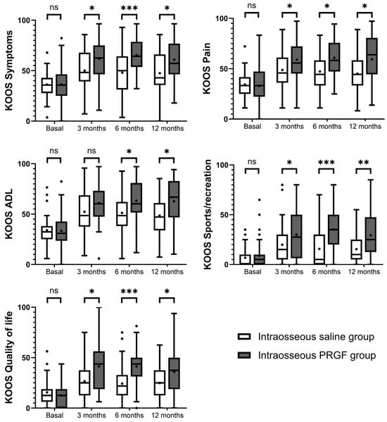 Figure 2 illustrates the follow-up for this variable. Regarding the intra-group analysis, both the intraosseous PRGF group and the intraosseous saline group showed statistically significant improvements from baseline in all five KOOS domains at the 3, 6, and 12-month follow-up points (Table 2). For the intraosseous PRGF group, the improvements in Symptoms, Pain, Activities of Daily Living, Sports/recreation, and Quality of Life were highly significant (p < 0.001) at all time-points compared to their baseline values. The intraosseous saline group also experienced significant improvements from baseline at all follow-ups across all subscales, with p values ranging from 0.047 to <0.001. In the intergroup comparison (Table 2), no statistically significant differences were observed between the groups at baseline for any of the KOOS subscales. However, at all subsequent follow-up points, the IO PRGF group showed significantly greater improvement than the IO saline group in nearly all domains. Specifically, for the KOOS Symptoms, Pain, Sports/recreation, and Quality of Life subscales, the intraosseous PRGF group’s scores had significantly greater improvement at 3, 6, and 12 months (Table 2). For the KOOS Activities of Daily Living domain, the intraosseous PRGF group also demonstrated significantly better results at 6 months (p = 0.007) and 12 months (p = 0.002), though the difference at 3 months did not reach statistical significance (p = 0.050).