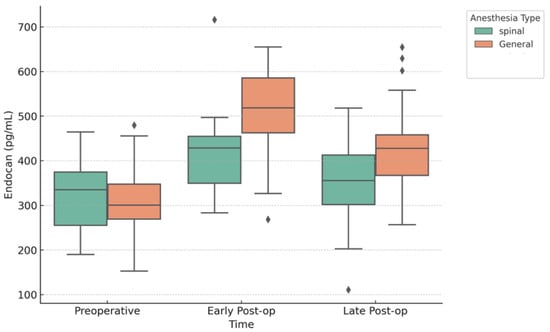 Surgical duration differed significantly between groups, which may independently influence systemic inflammatory responses and endothelial activation. While multivariate analyses adjusting for surgical duration confirmed that anesthesia type remained an independent predictor of endocan levels, residual contributions from procedural factors—including fluid therapy, anesthetic agents, and perioperative drug use—cannot be fully excluded. Other perioperative variables, such as blood loss or vasopressor use, were not systematically recorded and could also impact endothelial responses.