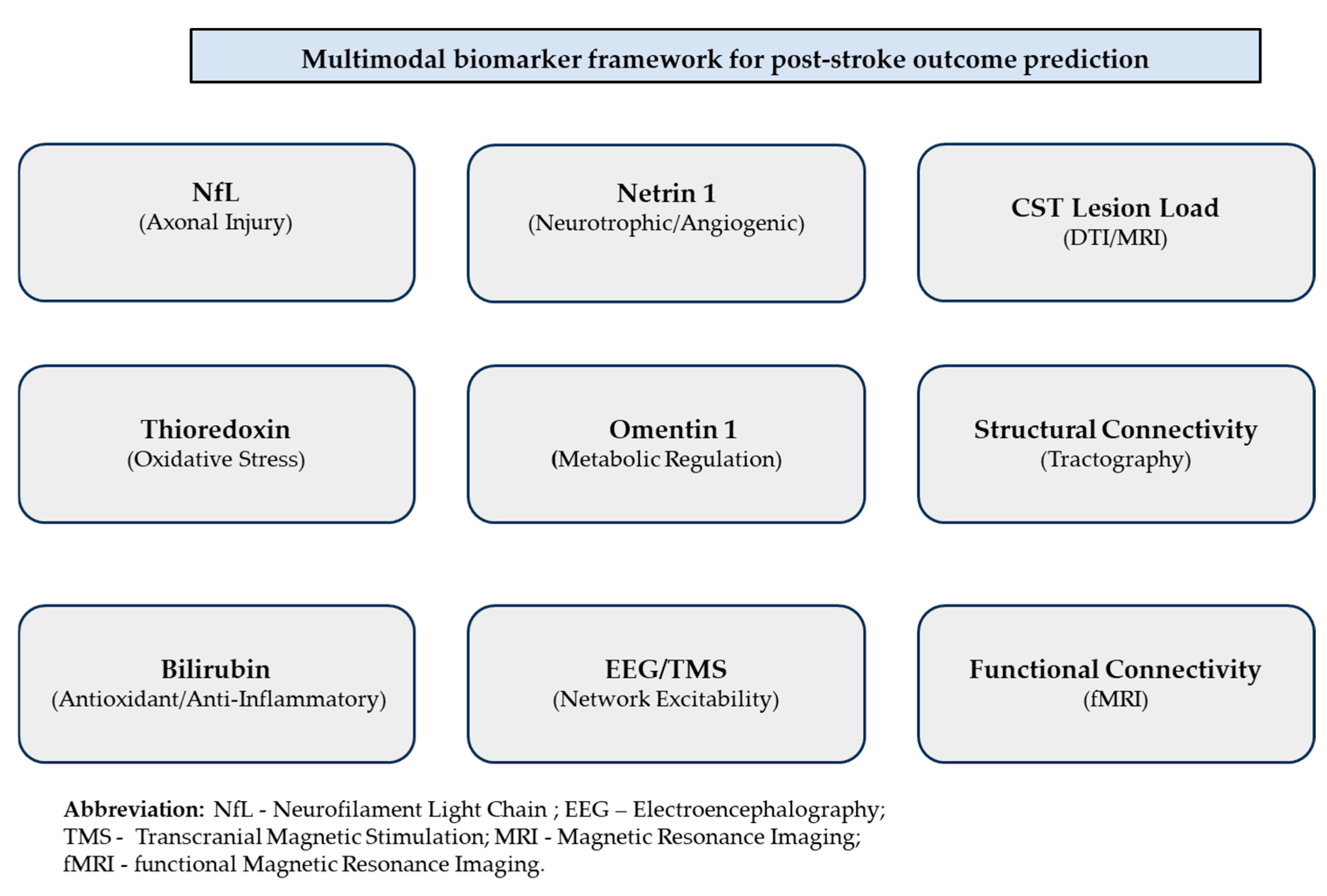 The integrative approach to post-stroke rehabilitation outcomes prognosis highlights the relationship between structural imaging, molecular markers, and network-level dynamics. Structural disconnection (imaging), axonal damage (NfL), systemic oxidative stress (bilirubin and thioredoxin), and cortical excitability (EEG/TMS) are all convergent axes to a single pathophysiological continuum. Personalized rehabilitation planning and trial grading will be made possible by future systems that integrate various modalities using verified, explicable machine learning algorithms.