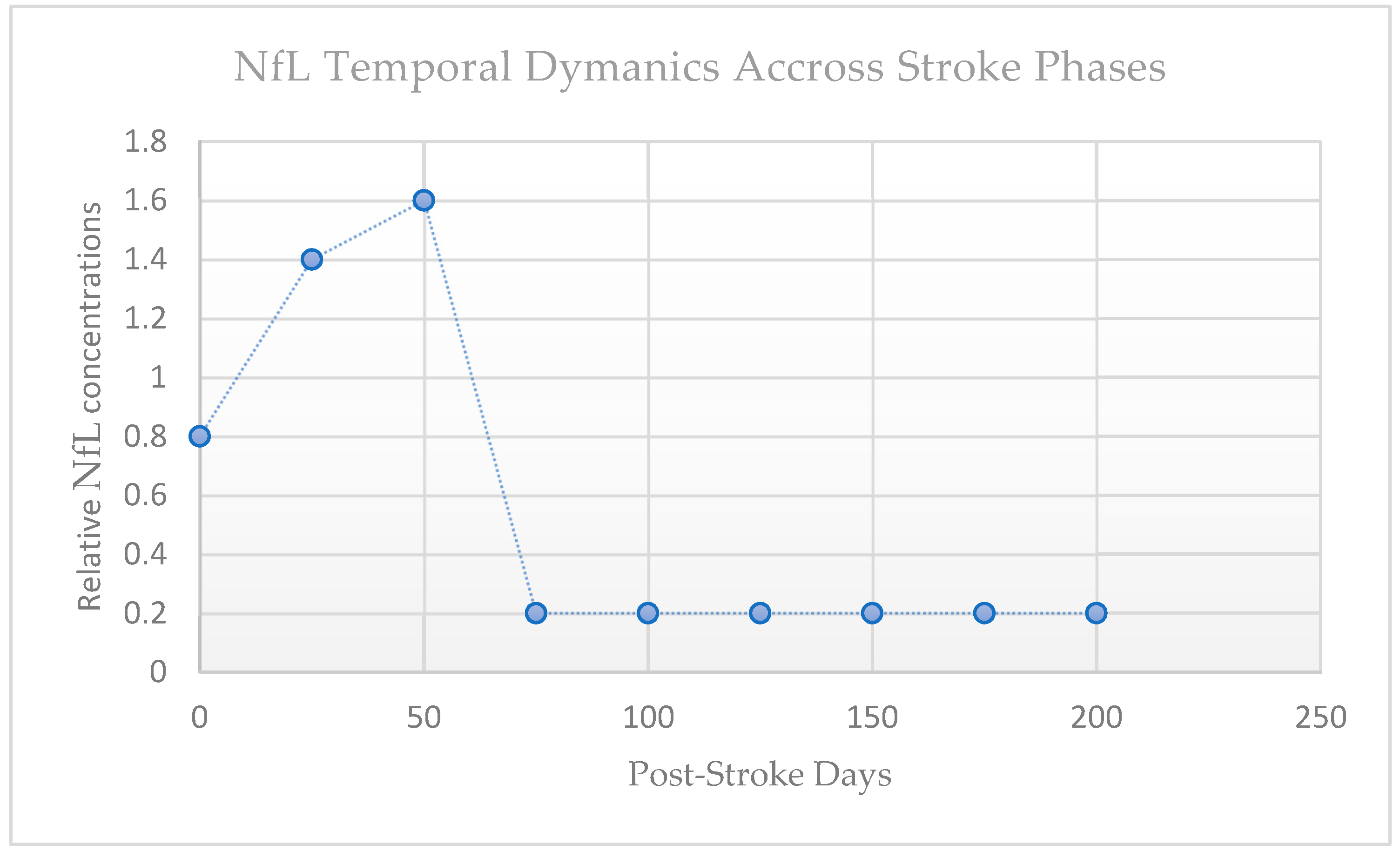 Recent studies further refine the temporal interpretation and prognostic relevance of circulating NfL after ischemic stroke. According to a 2019 study, serum levels of NfL rise in the acute phase and typically peak around one month, with higher concentrations strongly predicting poorer functional recovery at both 3 and 7 months, thereby reinforcing the value of subacute sampling [