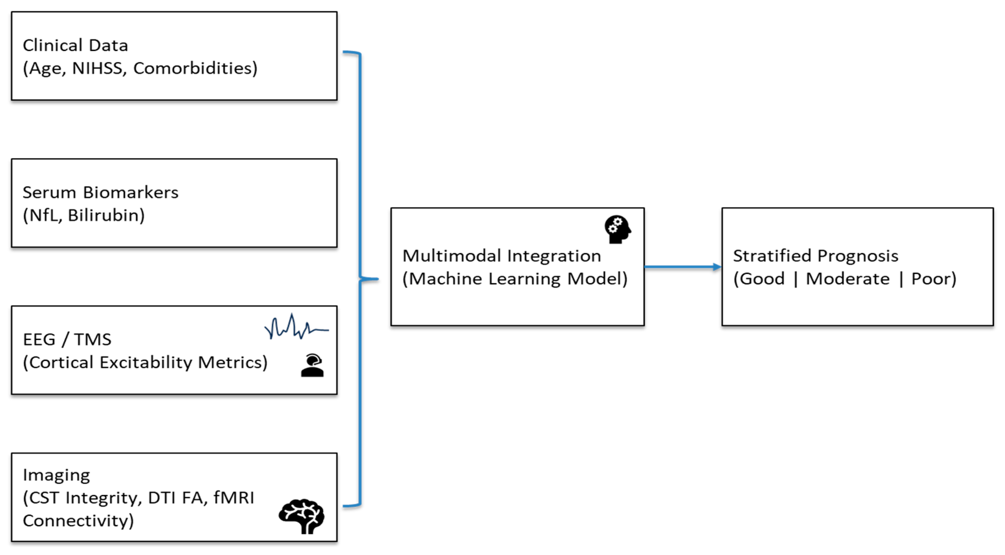 66]. An early motor recovery potential prediction may help guide patient and family counseling, maximize resource allocation, and allow for customized rehabilitation intensity. Imaging-derived CST integrity combined with circulating NfL and bilirubin levels provides a multimodal measure of damage severity, systemic stress, and brain adaptation [