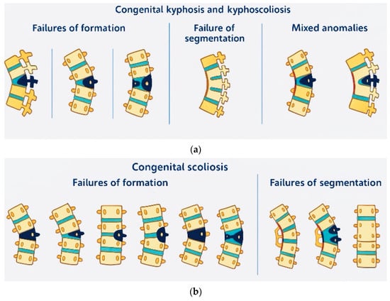 (a) Pathophysiology and classification of congenital deformities (kyphosis and kyphoscoliosis) adapted for the study [1,2,3,5,8]. (b) Pathophysiology and classification of congenital deformities (scoliosis) adapted for the study [1,2,3,5,8].