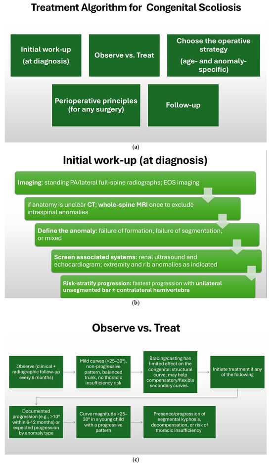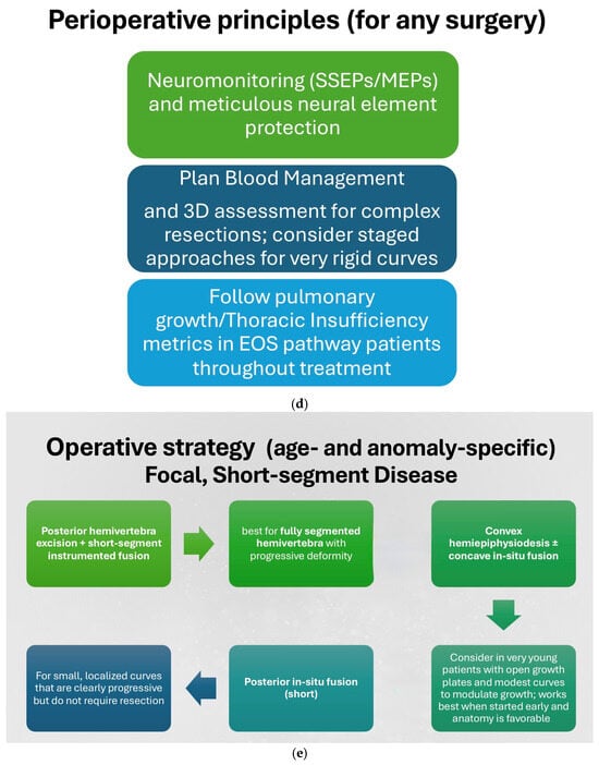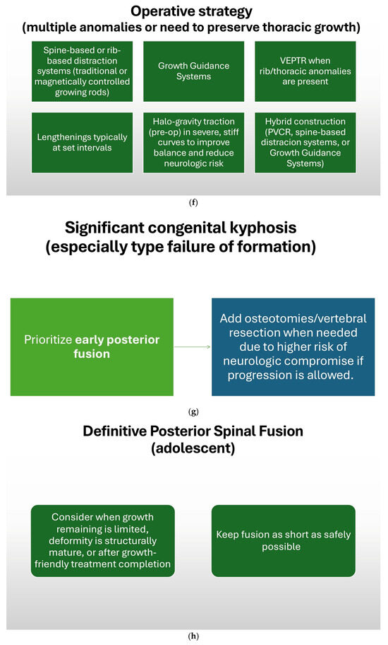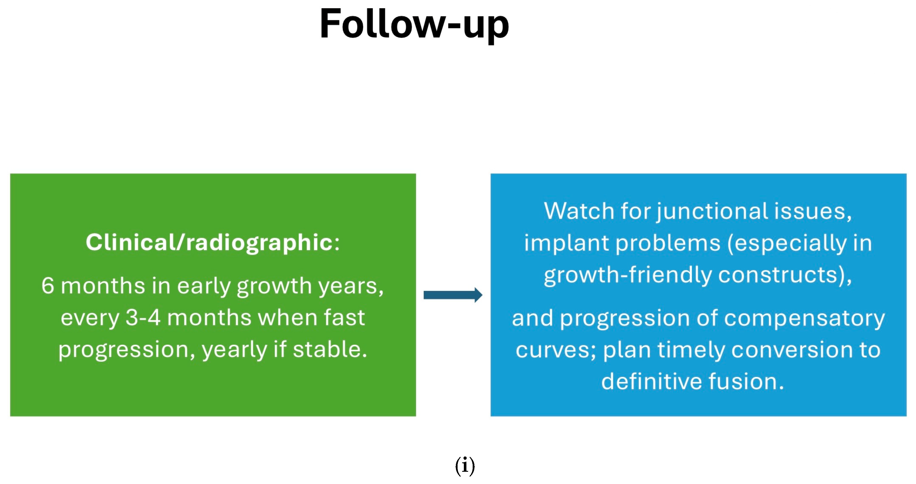 Contemporary management integrates advanced imaging, genetic counseling, and multidisciplinary expertise to develop individualized treatment plans. These plans must account not only for the spinal deformity itself but also for associated systemic conditions and the psychosocial impact on patients and families [6]. Decision-making is therefore multifactorial, involving considerations of anomaly type, progression risk, patient age, growth potential, and family preferences, all weighed against the benefits and risks of available surgical options [8,9,10].