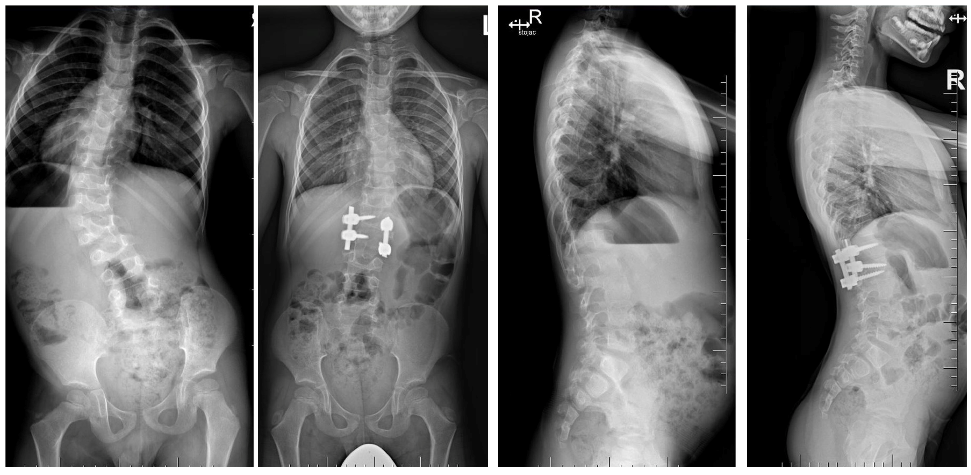 X-rays of 5-year-old girl with congenital progressive and rigid kyphoscoliosis treated with posterior vertebral column resection at T3–T4 level.