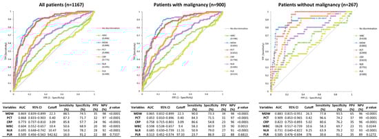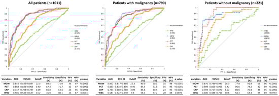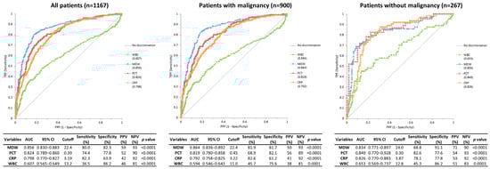 In patients with malignancy, the diagnostic performance pattern of biomarkers for the identification of sepsis was similar to that of all patients. For the Sepsis-3 criteria, MDW showed an AUC of 0.865. Other biomarkers showed an AUC of 0.853 for PCT, 0.758 for CRP. In patients without malignancy, PCT demonstrated the best discriminative ability for sepsis, with an AUC of 0.909, followed by MDW (0.883) and CRP (0.823).