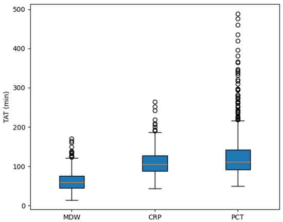 TATs for MDW, CRP, and PCT were compared in 561 patients who had all three measurements performed (Figure 5). The median TATs were 59 min, 105 min, and 111 min, respectively. MDW showed a significantly shorter TAT than both CRP and PCT (p < 0.0001 for both comparisons).