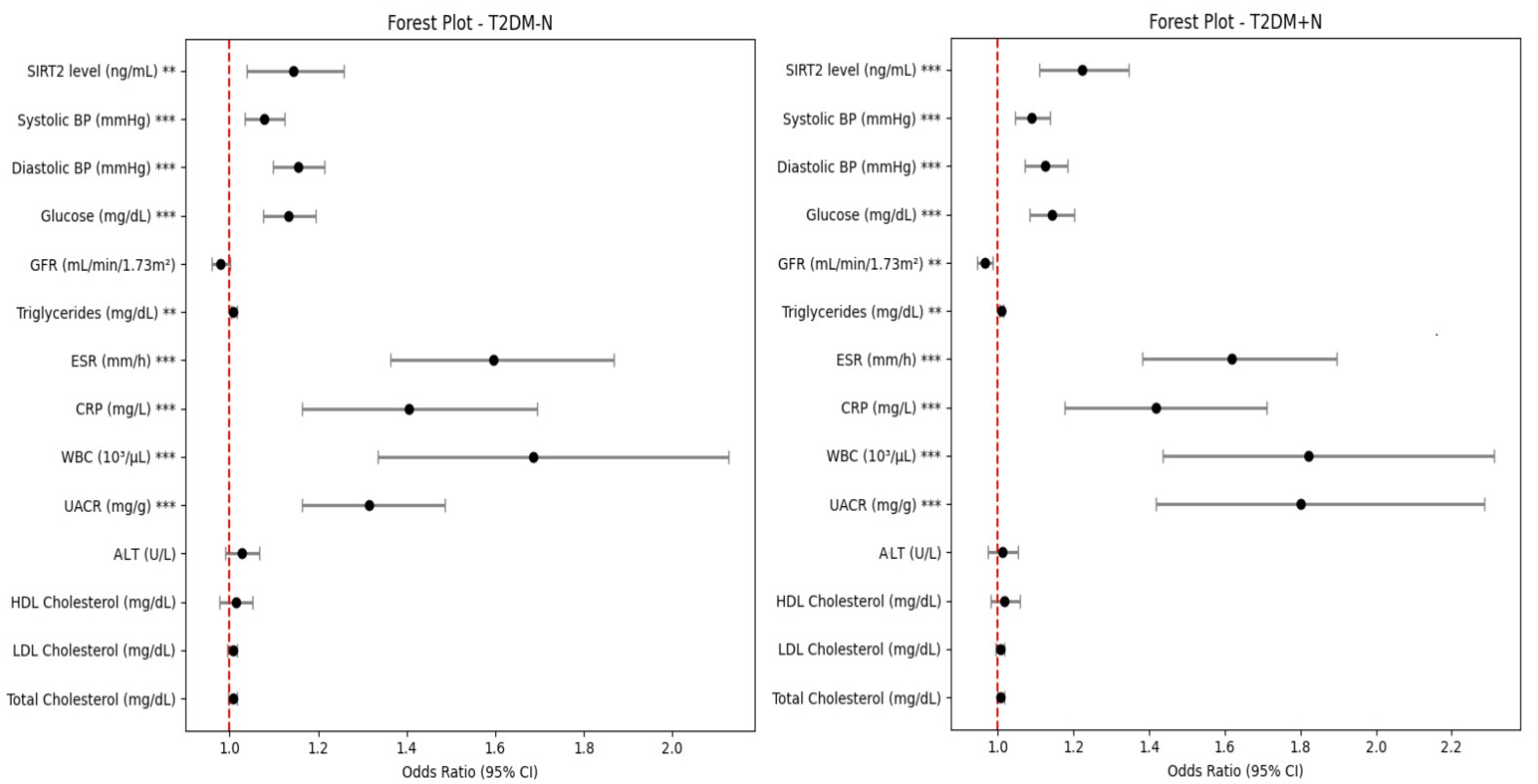 Figure 4), the SIRT2 odds ratios and their 95% confidence intervals lie entirely to the right of the OR = 1 reference line in both comparisons, indicating a statistically significant positive association. eGFR demonstrated a protective association that was significant in the nephropathy group (OR = 0.965, 95% CI 0.944–0.986,
