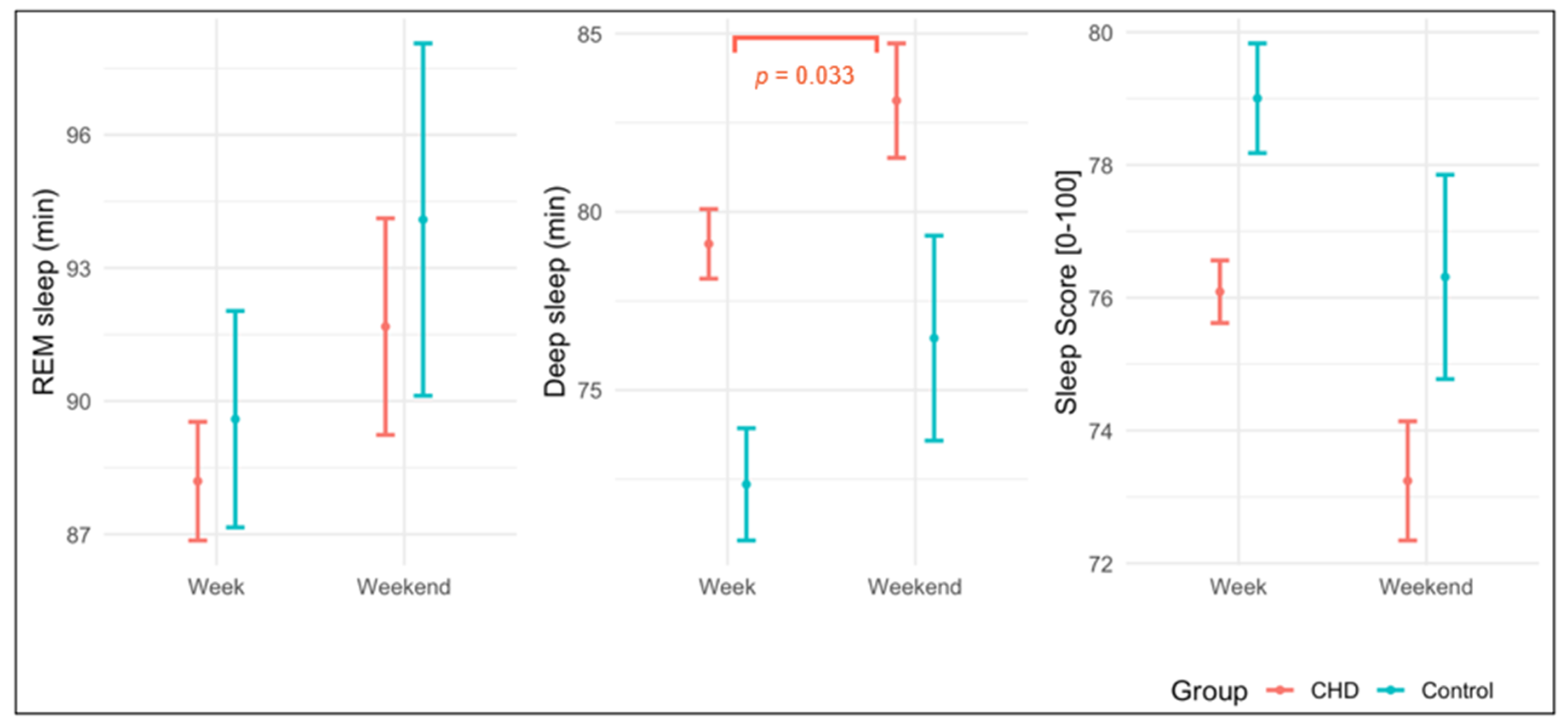 Within the CHD group and the controls, REM sleep did not significantly differ between weekdays and weekends (CHD: weekdays: 88 ± 37 min vs. weekends: 92 ± 44 min; p = 0.211; controls: weekdays: 90 ± 38 min vs. weekends: 94 ± 40 min; p = 0.336). For deep sleep, CHD patients exhibited significantly more deep sleep on weekends (83 ± 29 min) compared to weekdays (79 ± 27 min; p = 0.033). Among controls, these differences were not significant (weekdays: 72 ± 25 min vs. weekend: 76 ± 29 min; p = 0.213). The Sleep Score showed a trend difference between weekdays and weekends in CHDs (CHD: weekdays: 76 ± 13 vs. weekends: 73 ± 16; p = 0.088; controls: weekdays: 79 ± 13 vs. weekends: 76.3 ± 15.3; p = 0.210). Figure 1 describes the differences in sleep parameters between weekdays and weekends.