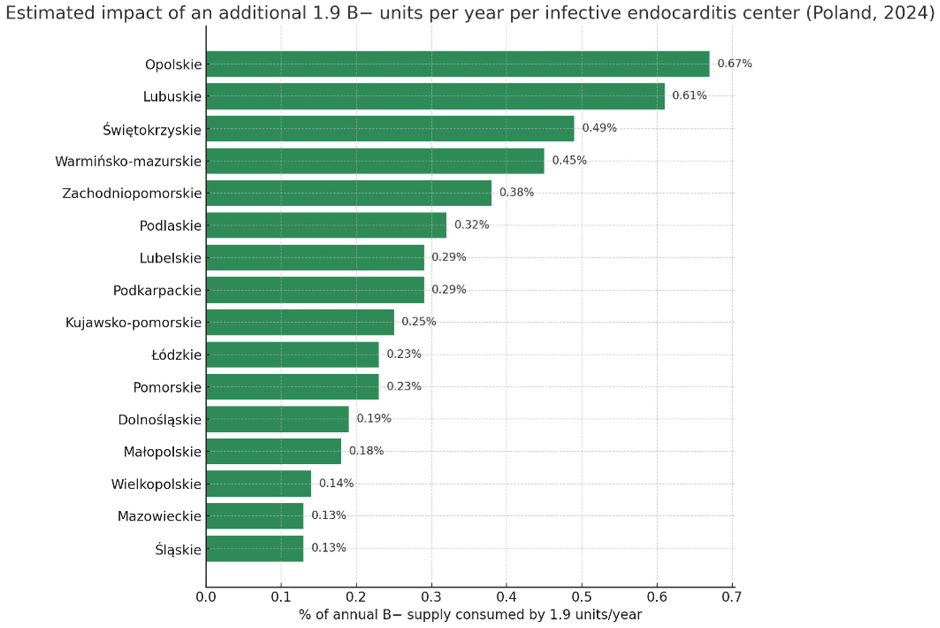 Figure 1. Estimated impact of additional 1.9 B− units per year per one infective endocarditis surgical treatment center (by voivodeship/province, Poland 2024).