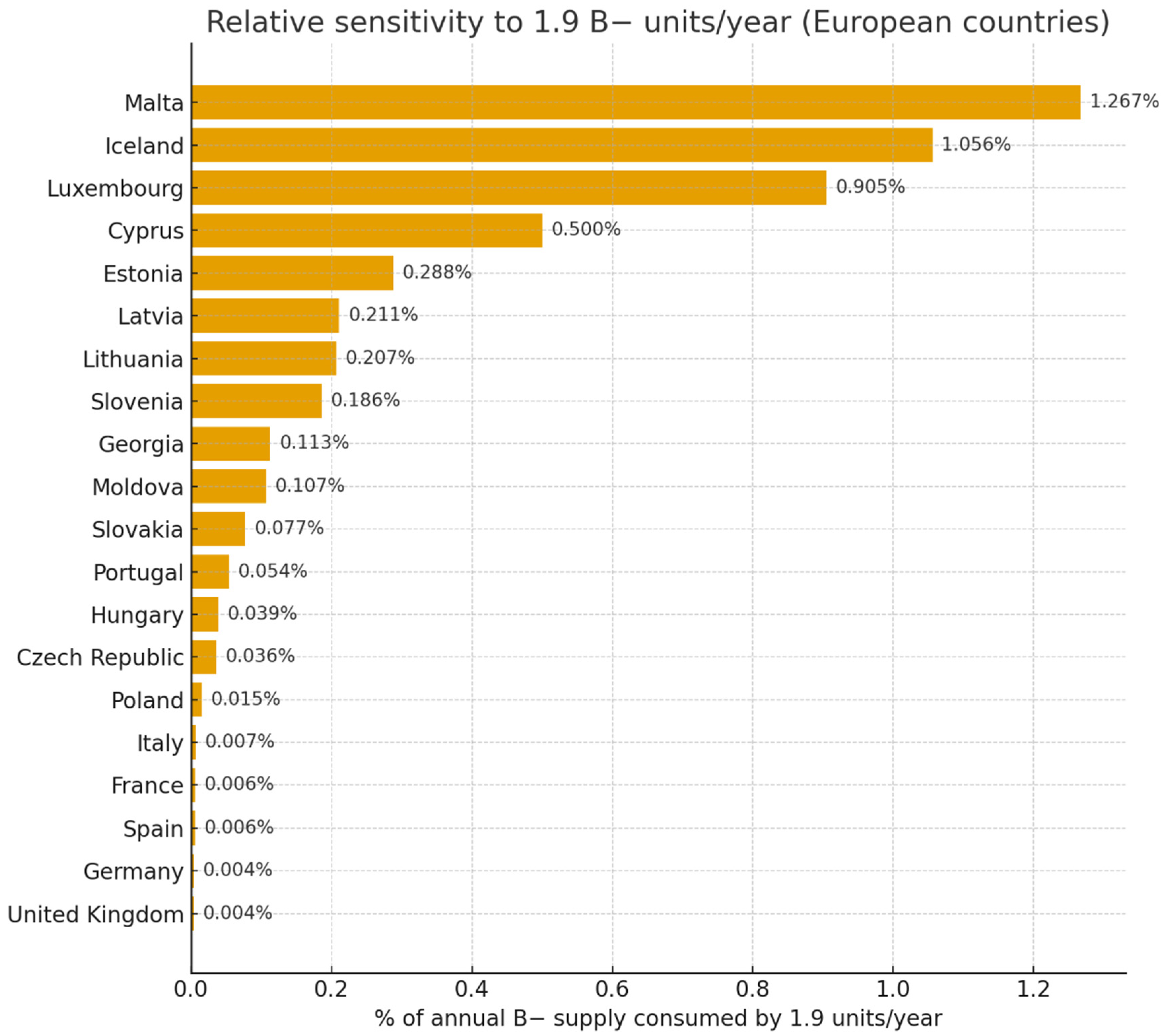 Furthermore, considering that B− overrepresentation may be typical among IE patients, analysis of online data from European national blood centers suggests that in smaller European countries, this excess annual use per surgical center could reach 0.2–1.3% of national B− reserves (e.g., Malta, Iceland, Luxembourg, Cyprus, Estonia, Lithuania, Latvia, and Slovenia) (Table 5, Figure 2).