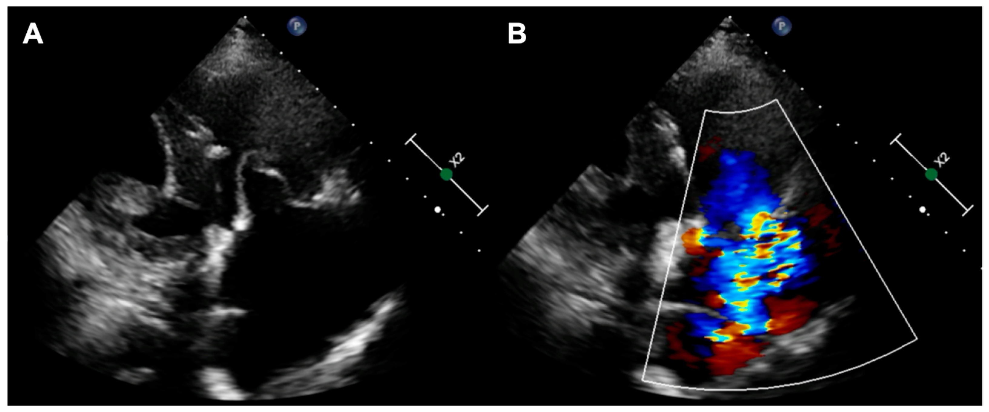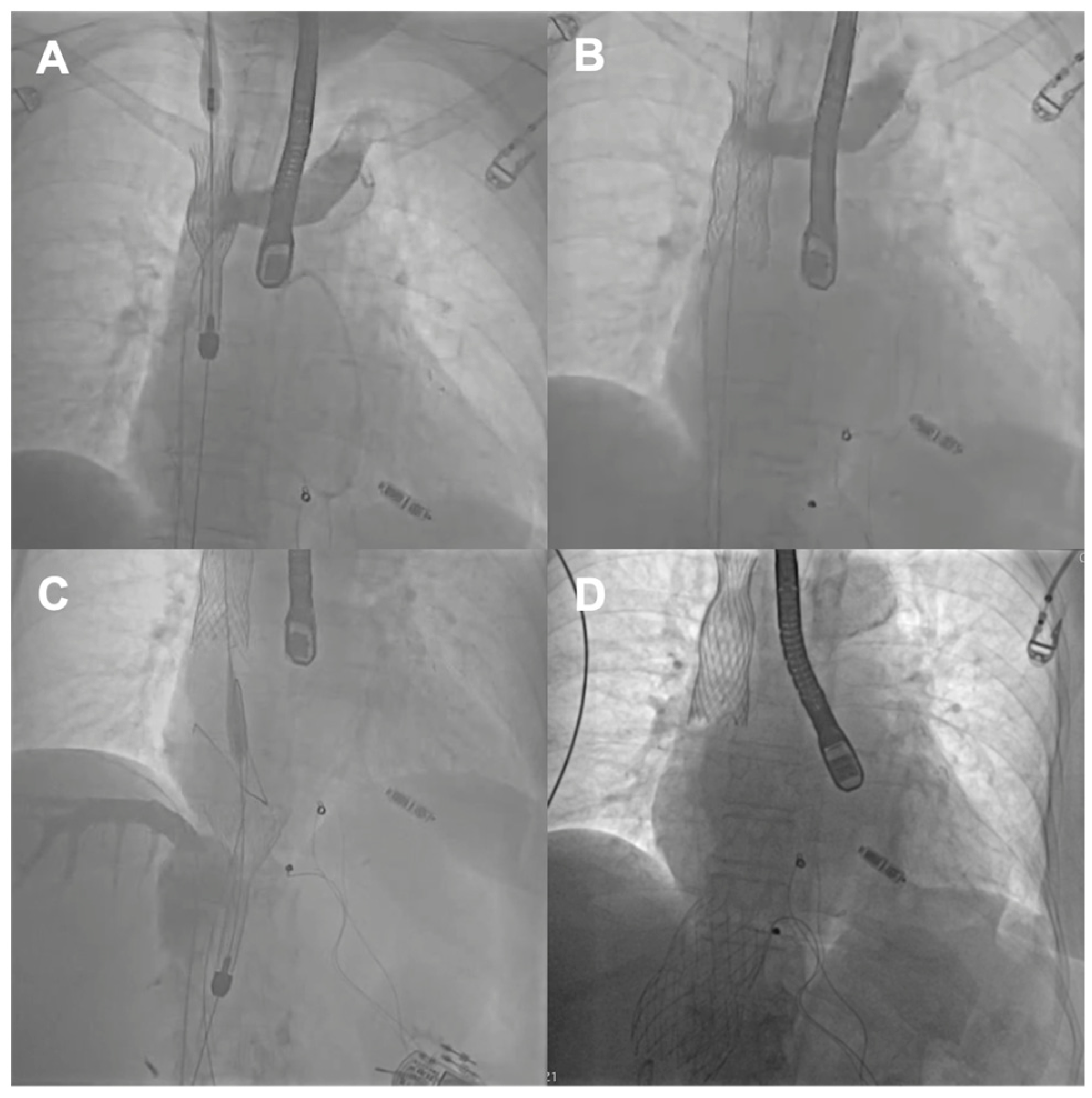 The last patient was a 66-year-old woman with torrential TR due to carcinoid heart disease in the context of multiple endocrine neoplasia (MEN) syndrome. The patient underwent peptide receptor radionuclide therapy with adjunctive chemotherapy for MEN disease, with confirmed hepatic metastases. The patient’s echocardiographic examination showed an enlarged right ventricle with preserved contractile function and a torrential TR with a large coaptation deficit of 18–20 mm. TricValve implantation (SVC 25 mm and IVC 35 mm) was carried out uneventfully. The patient’s echocardiography, after the procedure, confirmed the proper positioning and functioning of both valves, without a significant paravalvular leak. During the following months after the procedure, the patient’s condition improved and remained stable in NYHA functional class II. However, after a few months, the patient’s carcinoid disease worsened, and the patient died 7 months after the procedure due to progression of neoplastic disease.