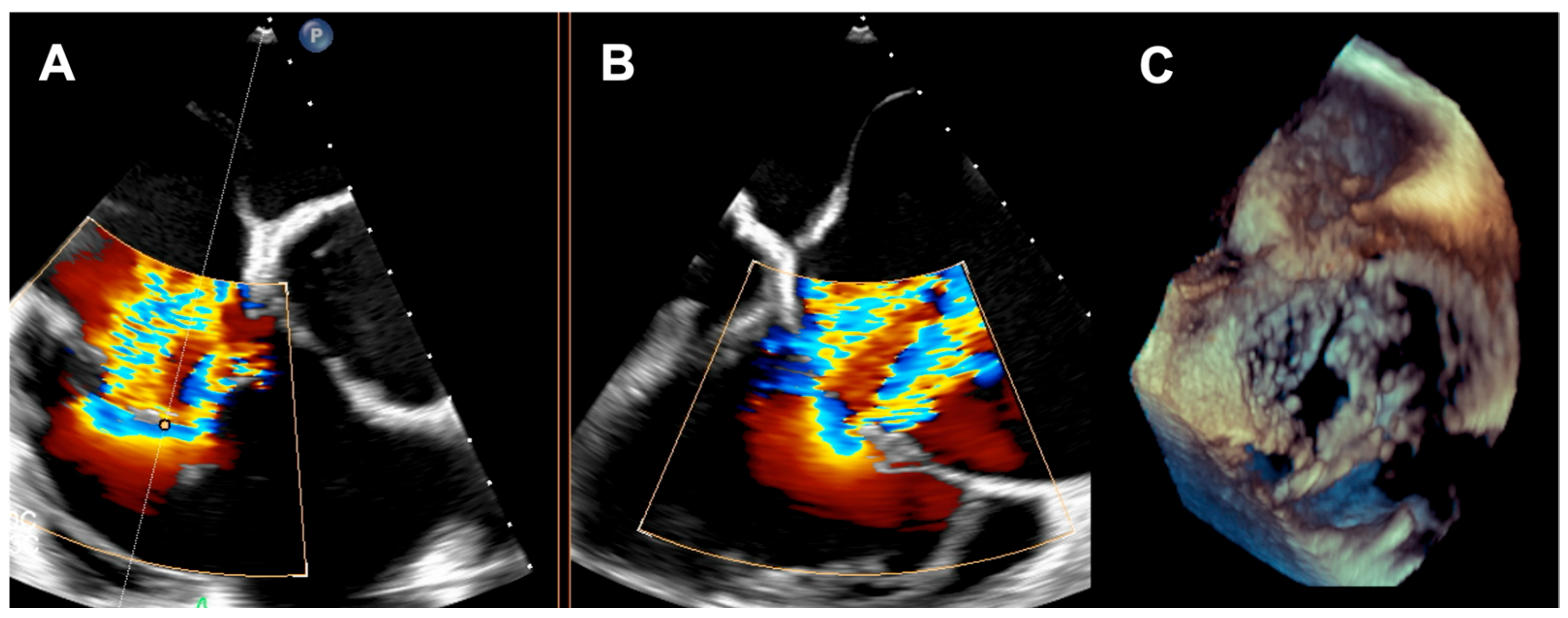 A 73-year-old woman with a history of two surgical interventions—an aortic valve replacement 25 years before and a thoracic aortic aneurysm repair 12 years before—was admitted to the hospital because of persistent heart failure symptoms in functional class NYHA III, accompanied by peripheral edema and ascites. The transthoracic echocardiography showed preserved function of the mechanical aortic prosthesis and torrential TR with tricuspid anulus enlargement. A further transesophageal examination revealed a large, mainly central coaptation deficit between the tricuspid leaflets, located mainly in the central region of the valve (
