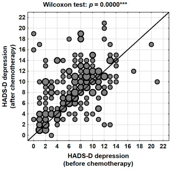 The clinical classification of HADS-D scores further corroborated these findings. The proportion of patients with scores within the normal range (≤7 points) decreased from 54.5% before chemotherapy to 38.9% after treatment. At the same time, the percentage of patients with clinically abnormal levels of depression (≥11 points) nearly doubled, rising from 19.4% prior to treatment to 35.5% following chemotherapy. The proportion of participants with borderline results (8–10 points) remained relatively stable (26.1% vs. 25.6%) (Table 5). This pronounced shift in score distribution indicates that chemotherapy acts as a factor exacerbating depressive symptoms and, in many cases, contributes to the transition of patients from borderline to clinically significant levels of depression.
