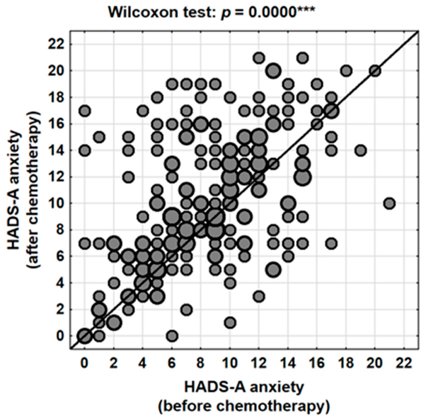 Moreover, in this study, the impact of variables such as comorbidities, prior psychiatric history (beyond the applied exclusion criteria), and the type and duration of chemotherapy on anxiety and depression levels was not analyzed. These factors could potentially influence the levels of anxiety and depression in the studied group and should be considered when interpreting the results. In future research, it would be advisable to include these variables in the statistical analysis or to use a more homogeneous study group in order to minimize the impact of these confounding factors. It should also be noted that the assessment of mental status was conducted three weeks after the completion of chemotherapy, that is, during a period of possible increased physical toxicity. Symptoms such as fatigue or weakness may overlap with depressive symptoms assessed using the HADS. Therefore, the increase in HADS scores may partially result from transient somatic symptoms rather than solely from changes in the patients’ psychological condition.
