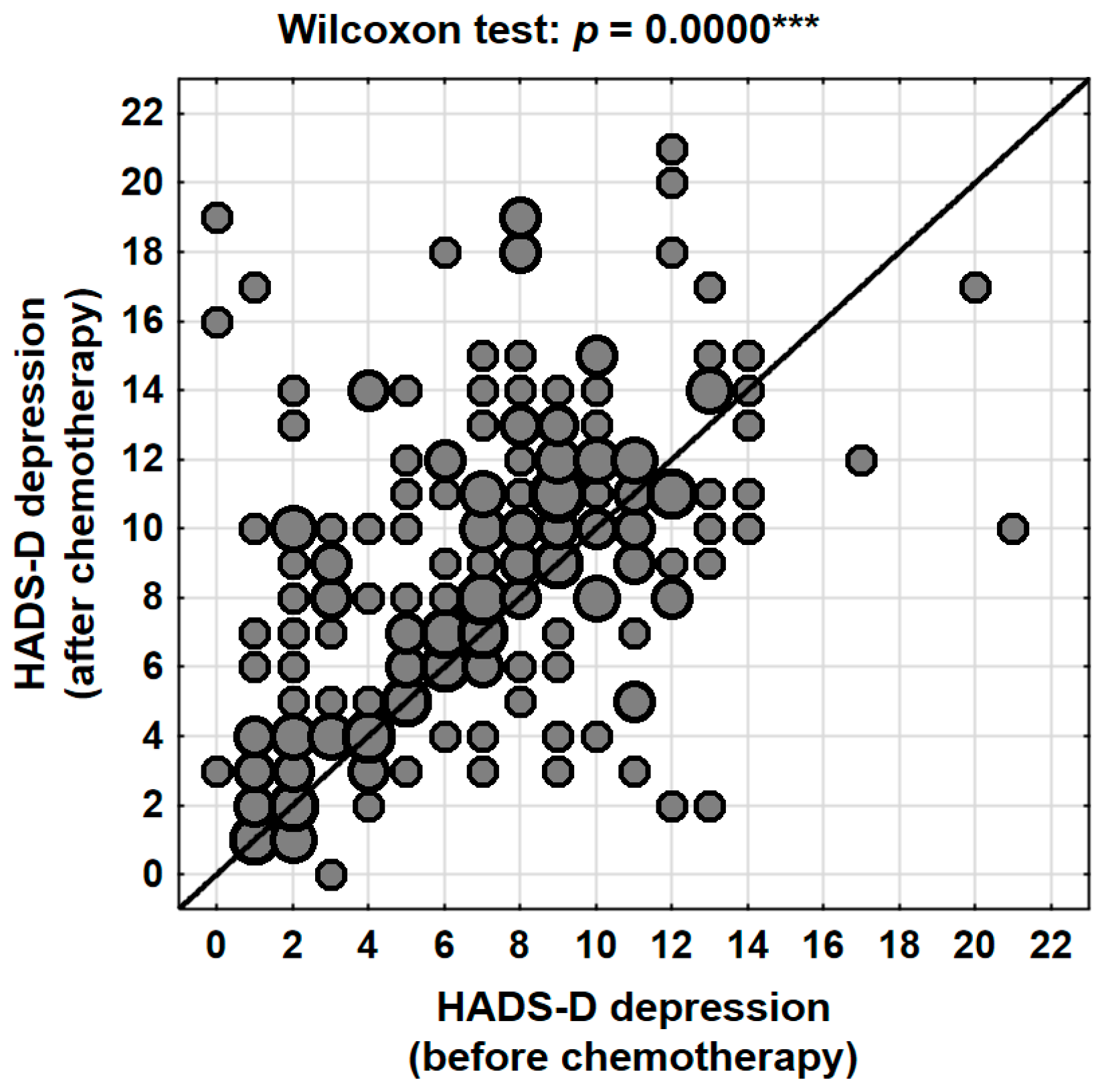 Statistical analyses were conducted using STATISTICA software, version 13. Descriptive statistics—including arithmetic mean, median, maximum and minimum values, standard deviation, and lower and upper quartiles—were used to summarize the distribution of anxiety and depression scores across the study population. Results are presented separately for assessments conducted before and after chemotherapy, as well as for changes observed between the two time points. In our study, statistical analyses were performed only for complete cases (complete-case analysis).