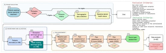 Eligible participants were 18–45 years old, each presenting with two contralateral Class II carious lesions in vital teeth diagnosed with reversible pulpitis. Teeth required intact proximal contacts, functional occlusion, and good oral hygiene. Exclusion criteria included pregnancy, irreversible pulpitis or necrosis, deep caries approaching the pulp, prior endodontic treatment, periodontal inflammation, parafunctional habits, or recent use of analgesics or anti-inflammatories. These criteria mirror contemporary postoperative sensitivity and Class II composite trials to ensure a homogeneous, low-risk cohort for pain outcomes [,,,,,].