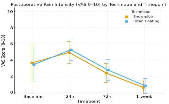 Mean Postoperative Pain Intensity (VAS 0 –10) Over Time for Snow-Plow and Resin Coating Techniques. (Note: Error bars represent standard deviations.