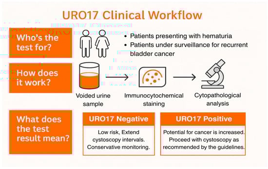 - Ibrahim, M.; Rabinowitz, J.; Hilbert, R.; Ghose, A.; Agarwal, S.; Swamy, R.; Vasdev, N. The Role of URO17® in Diagnosis and Follow-Up of Bladder Cancer Patients. BMC Urol. 2024, 24, 34–40. [Google Scholar] [CrossRef] [PubMed]