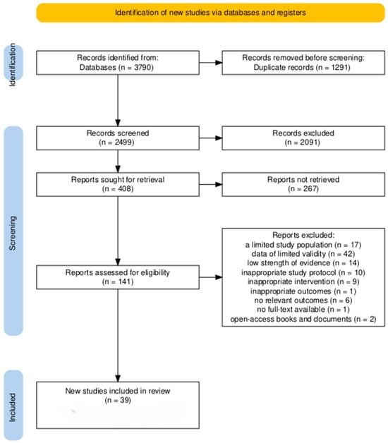 The review yielded a total of 3790 relevant studies. After the titles and abstracts were reviewed, 408 papers were included. After analysis, a total of 39 literature items that met the selection criteria were obtained. The largest groups consisted of systematic reviews and meta-analyses (n = 13), and original papers (n = 13), followed by systematic reviews (n = 6). Other types of articles included meta-analyses (n = 2), and individual publications: secondary analyses of survey data, scoping reviews, umbrella reviews, narrative reviews and Cochrane reviews (each n = 1).