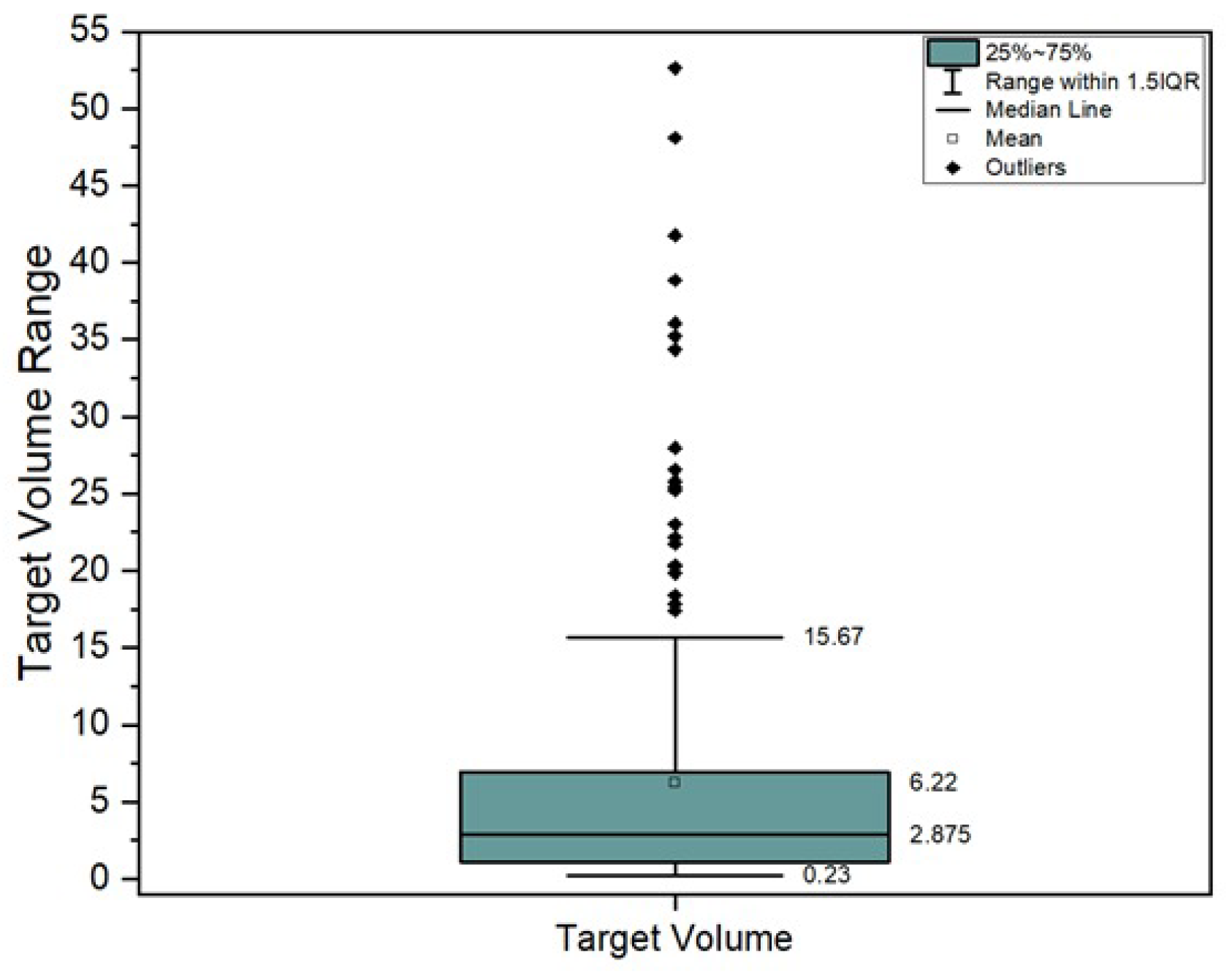 Figure 1 that target volumes larger than 20 cc are considered outliers. However, according to internal protocol, these kinds of large tumor volumes are also treated based on individual physician decisions with a larger number of fractions (e.g., five fractions). Such targets, while relatively uncommon, are still useful datapoints in determining the limitations of the protocol, technique, and technology observed in