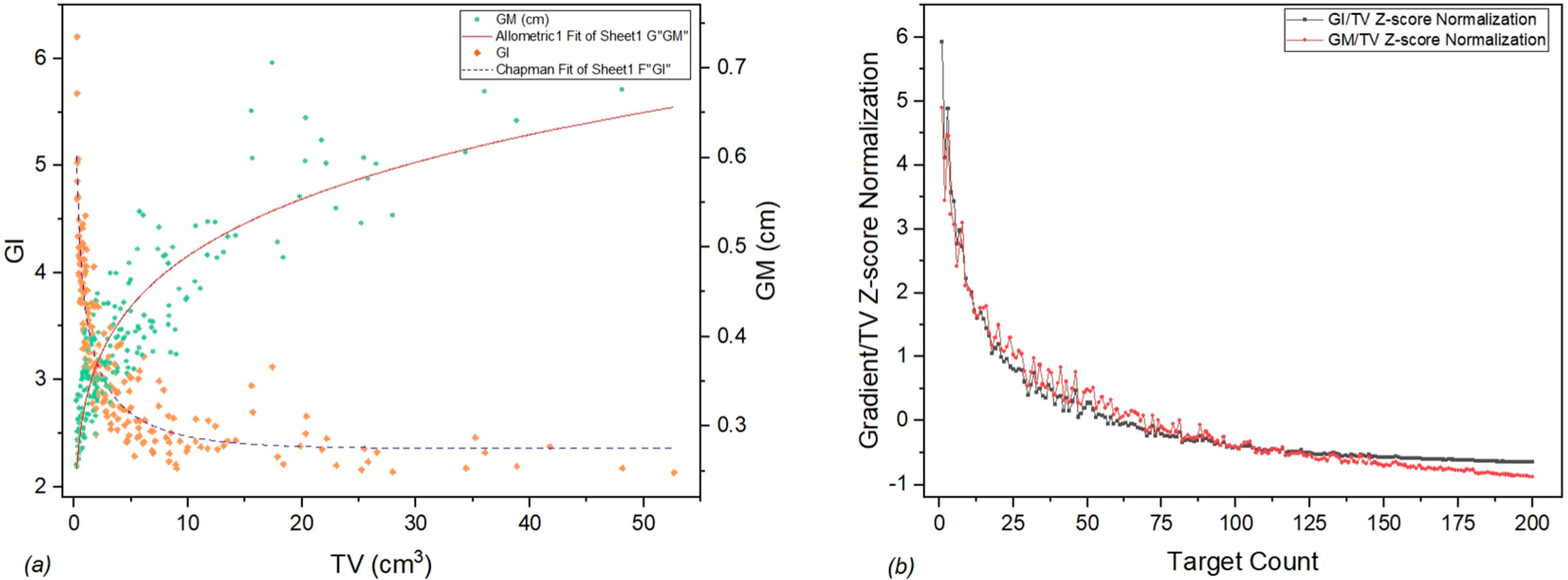 Our study focuses on testing the correlation significance and computing Spearman correlation value for GI/GM and TV. The choice was to use TV and not equivalent sphere diameter (EQSD) due to the granularity of the data, as both showed strong statistical significance (p value of 9.01 × 10−77 for EQSD and 1.38 × 10−76 for TV) with regard to correlation to gradients (Spearman correlation of −0.908 for EQSD and −0.907 for TV).