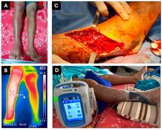 On day 2, the patient was started on intravenous ampicillin–sulbactam due to clinical signs of wound necrosis and secondary bacterial infection. On 30 May 2023 (day 7), the plastic surgery team performed surgical debridement to remove devitalized tissue and recommended the use of topical collagenase-based enzymatic dressings for ongoing wound management. By 3 June 2023 (day 11), laboratory investigations indicated partial control of the infection, as reflected in the reduction in inflammatory markers (Table 3). On the same day, VAWT at −125 mmHg was initiated (Figure 4A) and maintained until 20 June 2023 (day 29), in association with continued antibiotic treatment. During this period, the patient remained under evaluation by the plastic surgery team in preparation for definitive closure with a skin graft (Figure 4B–D).