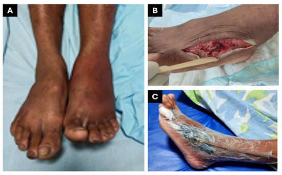 On 16 February 2023 (day 1), a 38-year-old male patient from Brazil—a carpenter with no known comorbidities and a previously healthy medical history, married and father of four—was bitten on the right foot by a pit viper snake (Bothrops spp.), most likely Bothrops atrox, while fishing near Boa Vista, Roraima, as he was leaving the pasture around 7:00 p.m. He was admitted to the General Hospital of Roraima (HGR) at 10:30 p.m. on the same day and was administered six vials of antibothropic antivenom (SAB, soro antibotrópico, from Instituto Butantan, São Paulo, Brazil), classifying the envenoming as moderate. Upon admission, he presented with swelling extending to the knee, intense pain, no fever, preserved appetite, and normal urinary and bowel function. Upon arrival, laboratory tests revealed leukocytosis (26,500 white blood cells) and incoagulable blood (Table 1). On the second day after the bite (day 2), he was subsequently transferred to the Infectious Diseases Department of the General Hospital of Roraima (HGR). The affected limb measured 43 cm in circumference and had a temperature of 38 °C (Figure 1A), compared to 36 cm and 36.5 °C on the unaffected limb, with no signs of erythema or blisters. However, by day 6 (Figure 1B), the patient developed extensive erythema, blisters, and purulent exudate. On day 16, a CT scan of the affected area revealed an abscess with associated necrosis measuring approximately 19.4 × 6.3 × 3.7 cm, indicating the need for surgical drainage (performed on day 17) and initiation of antibiotic therapy with amikacin, teicoplanin, and ertapenem.