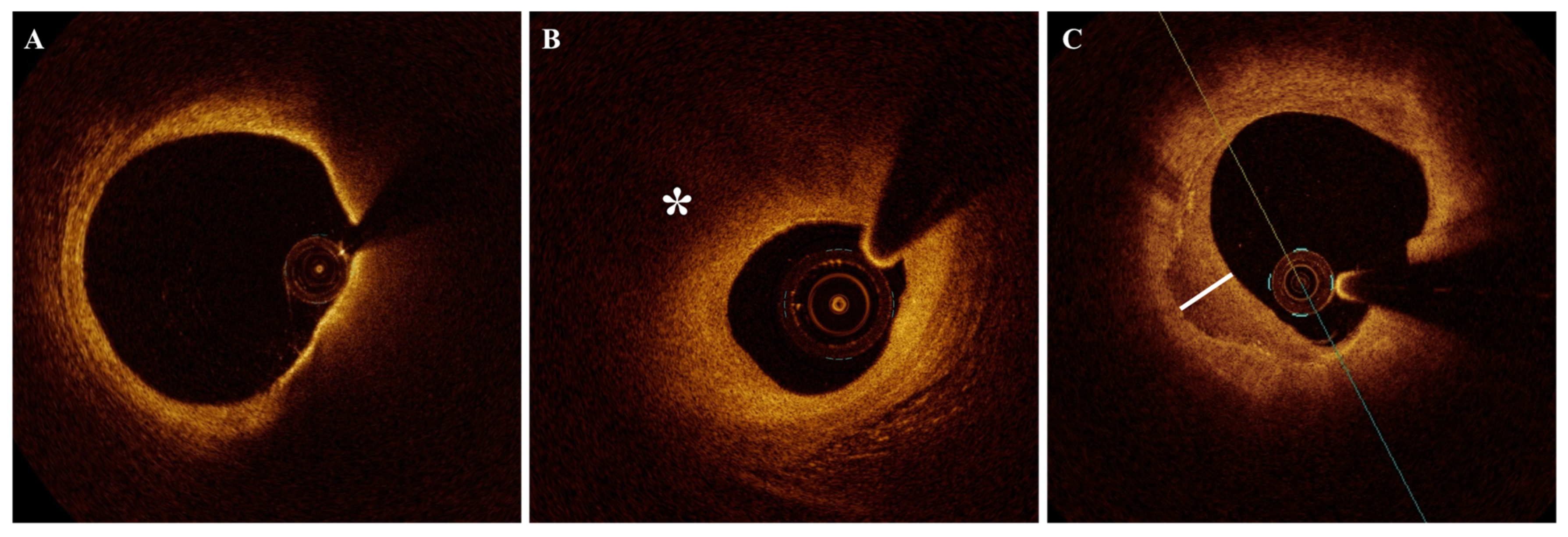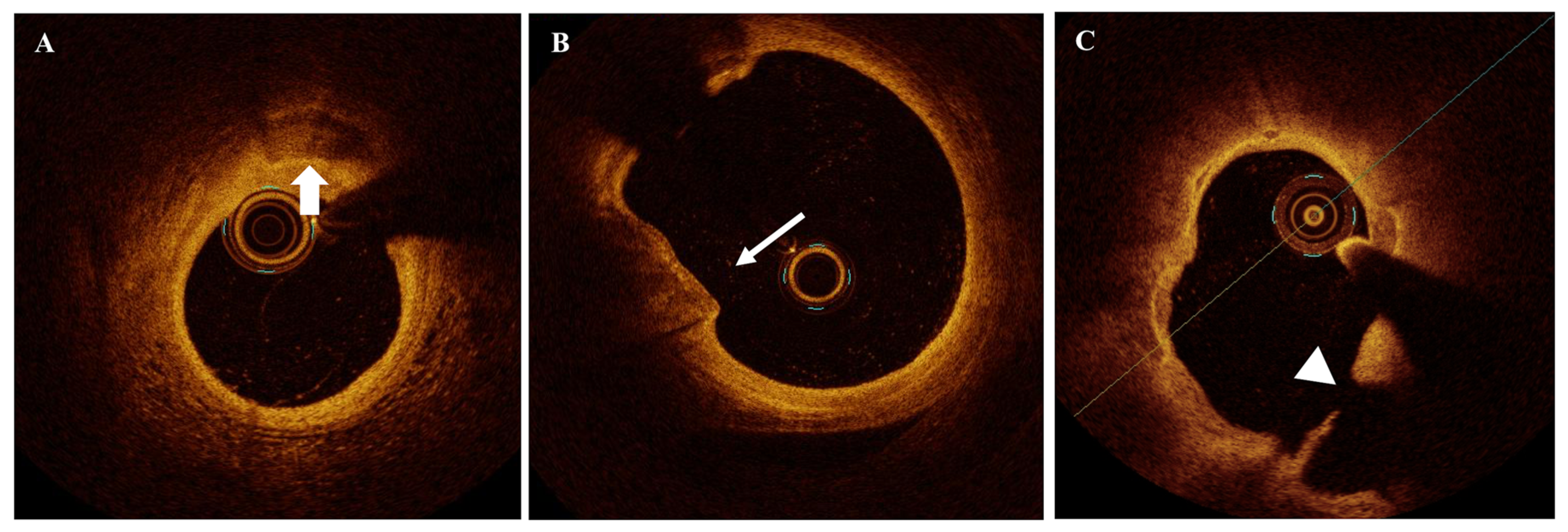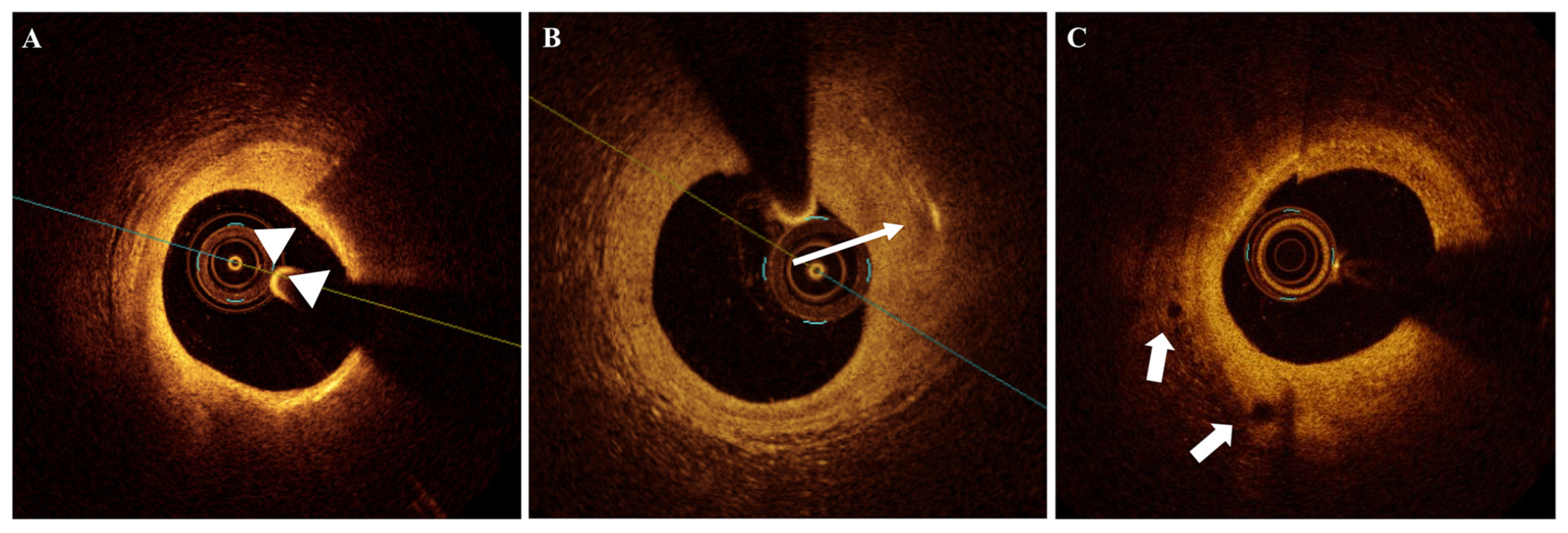 - Yamaji, K.; Kanenawa, K.; Morofuji, T.; Nishikawa, R.; Imada, K.; Kohjitani, H.; Watanabe, H.; Tazaki, J.; Taniwaki, M.; Koga, S.; et al. Serial Optical Coherence Tomography Assessment of Coronary Atherosclerosis and Long-Term Clinical Outcomes. J. Am. Heart Assoc. 2024, 13, e034458. [Google Scholar] [CrossRef] [PubMed] [PubMed Central]