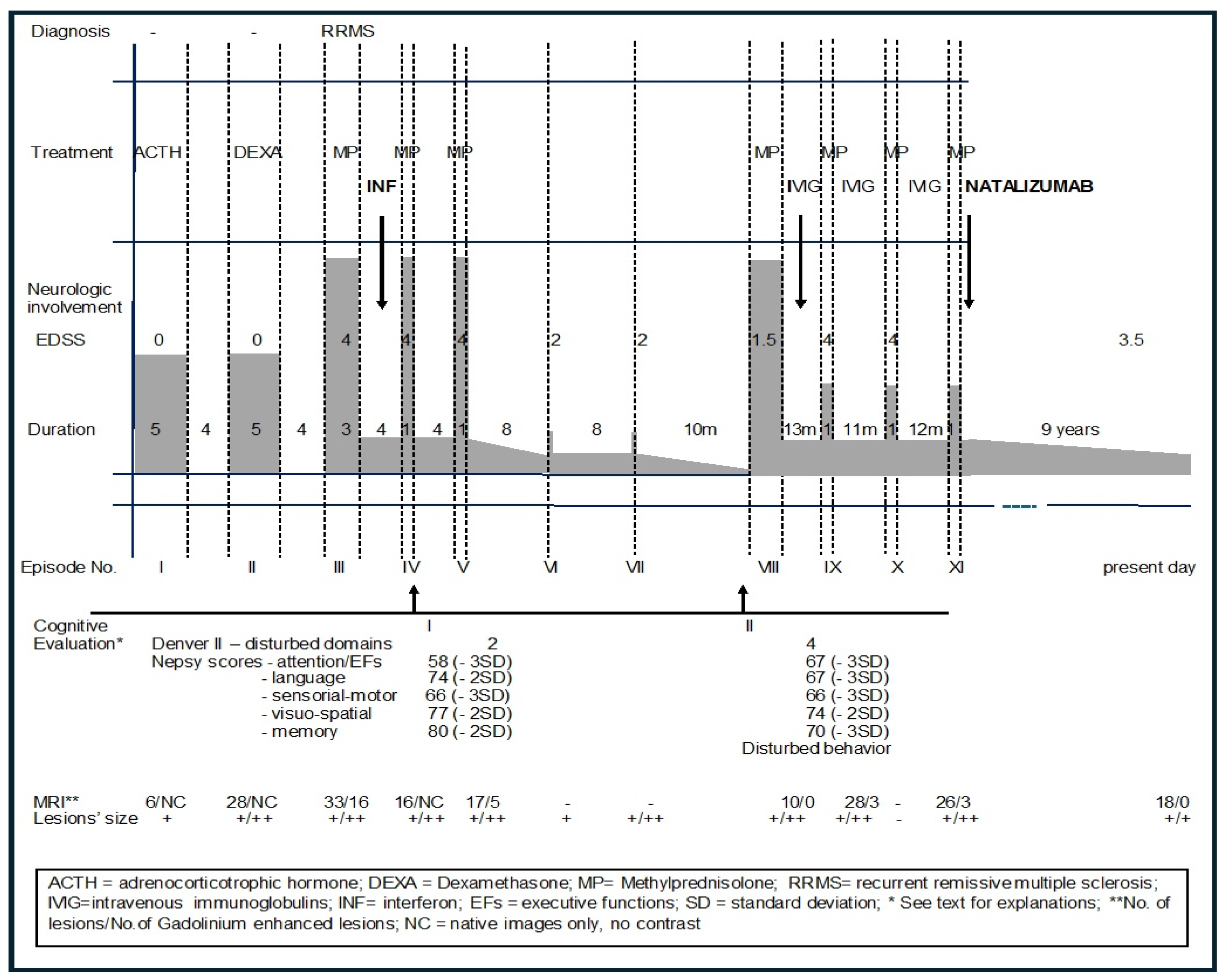 | Episode | Age | Symptoms | Episode Duration | Type of Remission | Residual Symptoms | Free Interval After Episode | Treatment in Episode | DMT | Observations |