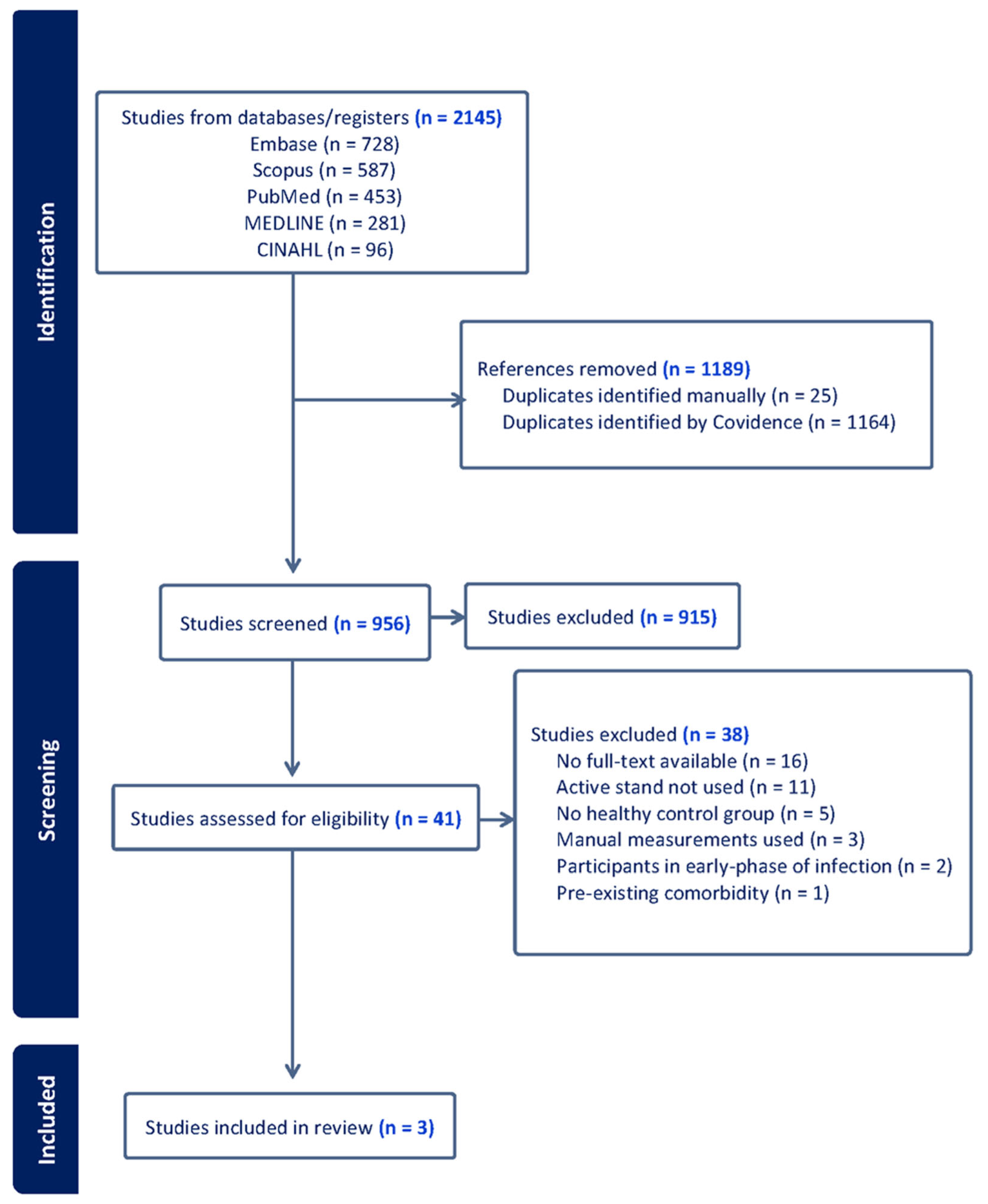 In total, 2145 references were identified and imported into Covidence for screening through database searches, with 1189 references removed as duplicates. A total of 956 studies were screened by title and abstract following duplicate removal, and 41 studies were screened on the full-text level. Three studies were included in the review following full-text screening. The PRISMA flowchart of study selection is provided in Figure 1.