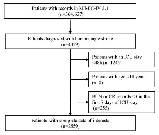 - Luo, H.; Yang, X.; Chen, K.; Lan, S.; Liao, G.; Xu, J. Blood Creatinine and Urea Nitrogen at ICU Admission and the Risk of In-Hospital Death and 1-Year Mortality in Patients with Intracranial Hemorrhage. Front. Cardiovasc. Med. 2022, 9, 967614. [Google Scholar] [CrossRef]