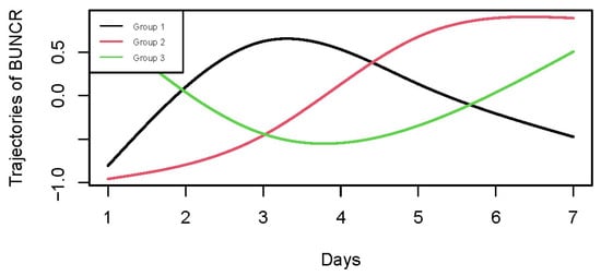 As previously reported, BUN primarily originates from the catabolism of endogenous proteins, and its plasma concentration is determined by four main factors: protein intake, the rates of amino acid anabolism and catabolism, and the hepatic capacity for urea production []. BUN is freely filtered by the glomerulus and subsequently reabsorbed in the renal tubules, making it highly sensitive to changes in renal function []. Importantly, plasma BUN levels depend not only on the GFR but also on tubular reabsorption, which is modulated by neurohormonal activity, including activation of the renin–angiotensin–aldosterone system (RAAS) activity []. Urea reabsorption primarily occurs in the proximal tubules, with additional reabsorption in the collecting ducts under the influence of vasopressin []. Various clinical conditions, such as gastrointestinal bleeding, high-protein intake, and extensive tissue breakdown, can also increase nitrogen metabolism and result in elevated BUN levels [,]. Serum creatinine (SCr), in contrast, is a byproduct of muscle metabolism and is one of the most widely used biomarkers to estimate renal function, as it correlates closely with GFR []. Since creatinine is largely derived from skeletal muscle, muscle wasting leads to reduced SCr production [], the level of which is also often used to reflect the constantly breaking-down status of skeletal muscles. Although creatinine is freely filtered by the glomerulus, a small portion is also secreted by renal tubules, which may lead to a tiny bias in the appraisal of GFR when using creatinine-based calculations []. Our findings may also reflect these relationships, with persistently elevated BUNCR trajectory (G2) potentially mirroring the combined effects of sustained urea production, reduced creatinine production, and possible amplification by tubular reabsorption mechanisms. These combined physiological dynamics underscore the importance of interpreting BUN and creatinine in tandem, particularly through the BUN-to-creatinine ratio (BUNCR), which may offer better insight into the balance between renal filtration and catabolic stress in ICU patients.