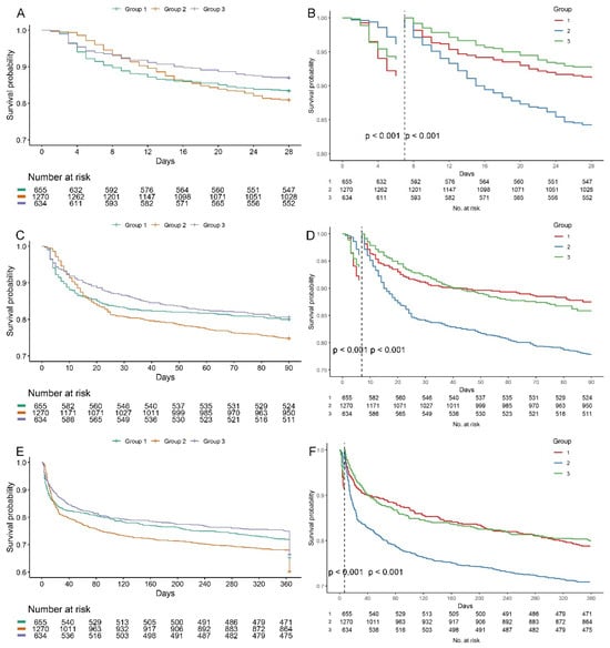 Kaplan–Meier survival curves according to BUNCR trajectory groups. Survival probabilities at 28 days (A), 90 days (C), and 1 year (E) after ICU admission are shown for each BUNCR trajectory group. Statistical differences were assessed using the log-rank test; all pairwise comparisons showed p < 0.001. (B,D,F) Seven-day landmark analyses were performed to account for early curve crossing and demonstrated significantly reduced survival probabilities in Group 2 beginning at day 7 after ICU admission (p < 0.05, log-rank test).